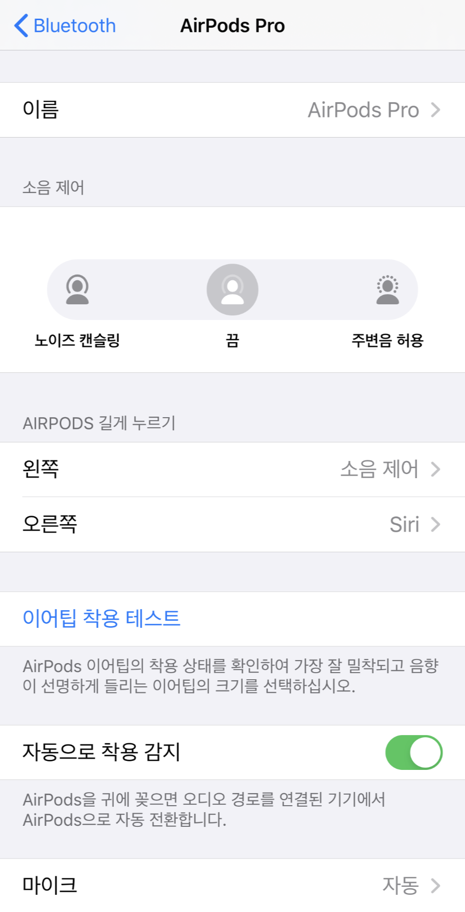 에어팟 프로의 액티브 노이즈 캔슬링을 해주는 소음 제어 기능에는 노이즈 캔슬링과 끔, 주변음 허용이 있었는데요.