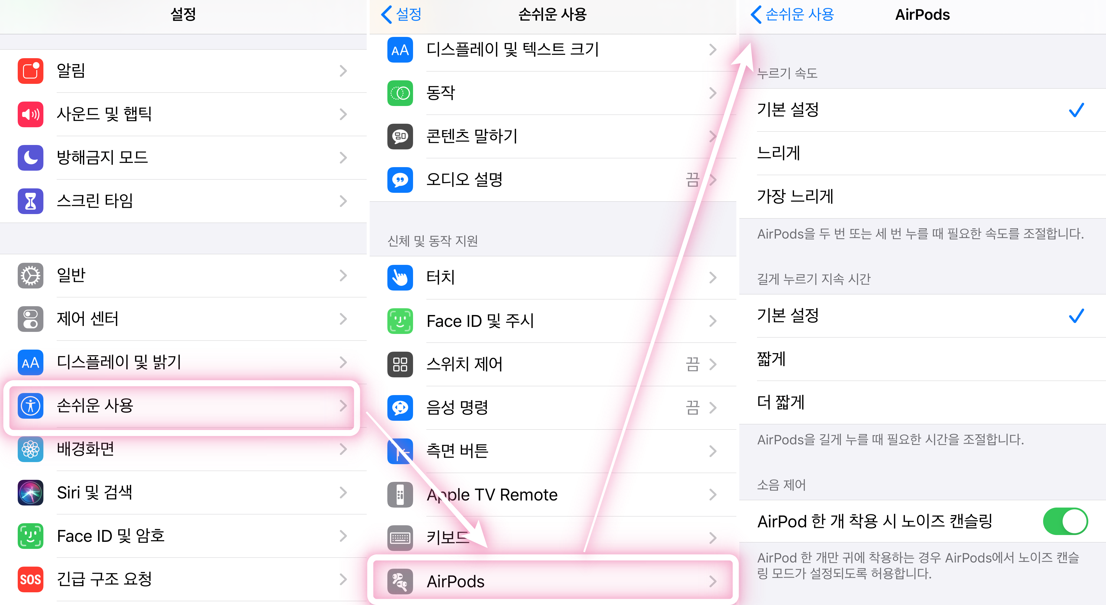 에어팟 프로의 손쉬운 사용 설정은 아이폰 설정에서 손쉬운 사용 > AirPods로 들어가면 나와요.