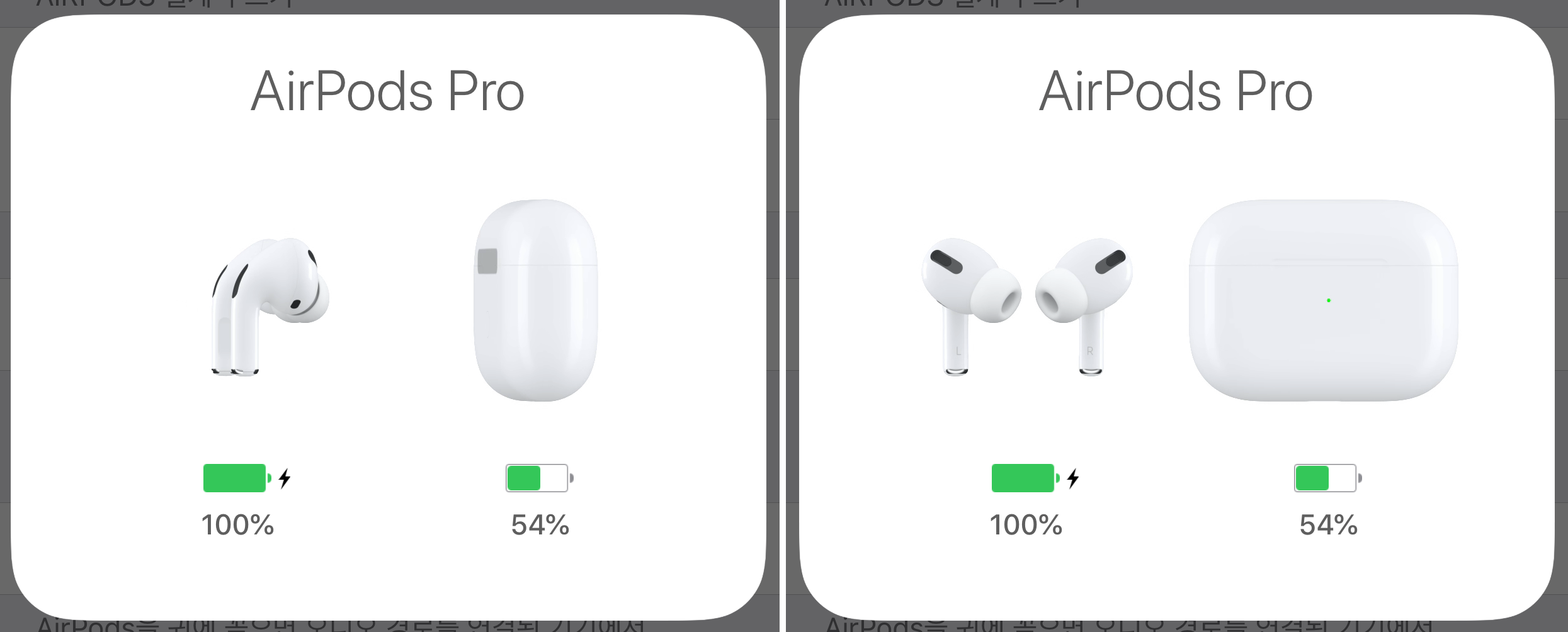 에어팟 프로와 케이스의 배터리 충전량이 표시가 돼요.