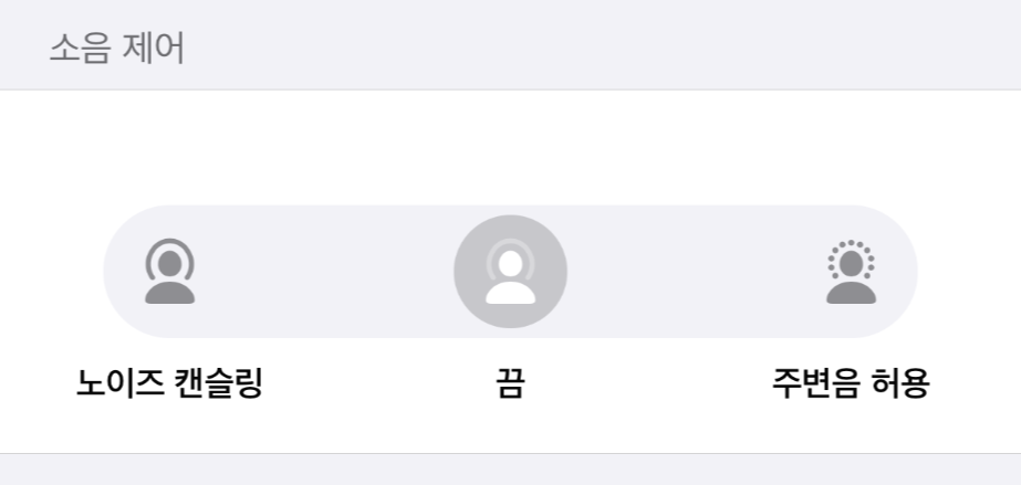 소음 제어 메뉴에는 노이즈 캔슬링, 끔, 주변음 허용이 있어요.
