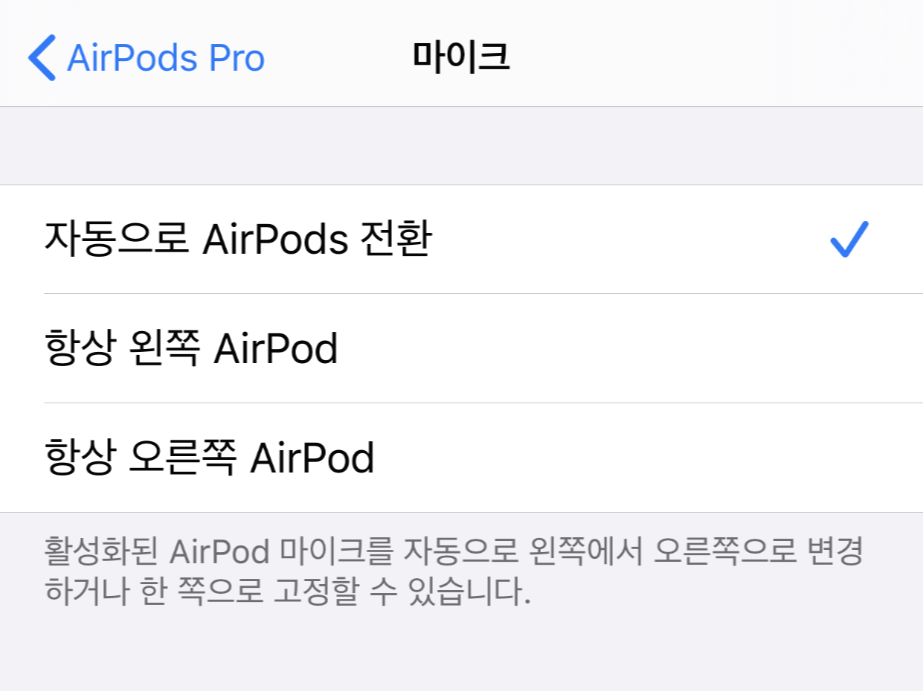 마이크 설정에는 '항상 왼쪽 AirPod', '항상 오른쪽 AirPod', '자동으로 AirPods 전환'의 세 가지가 있어요.
