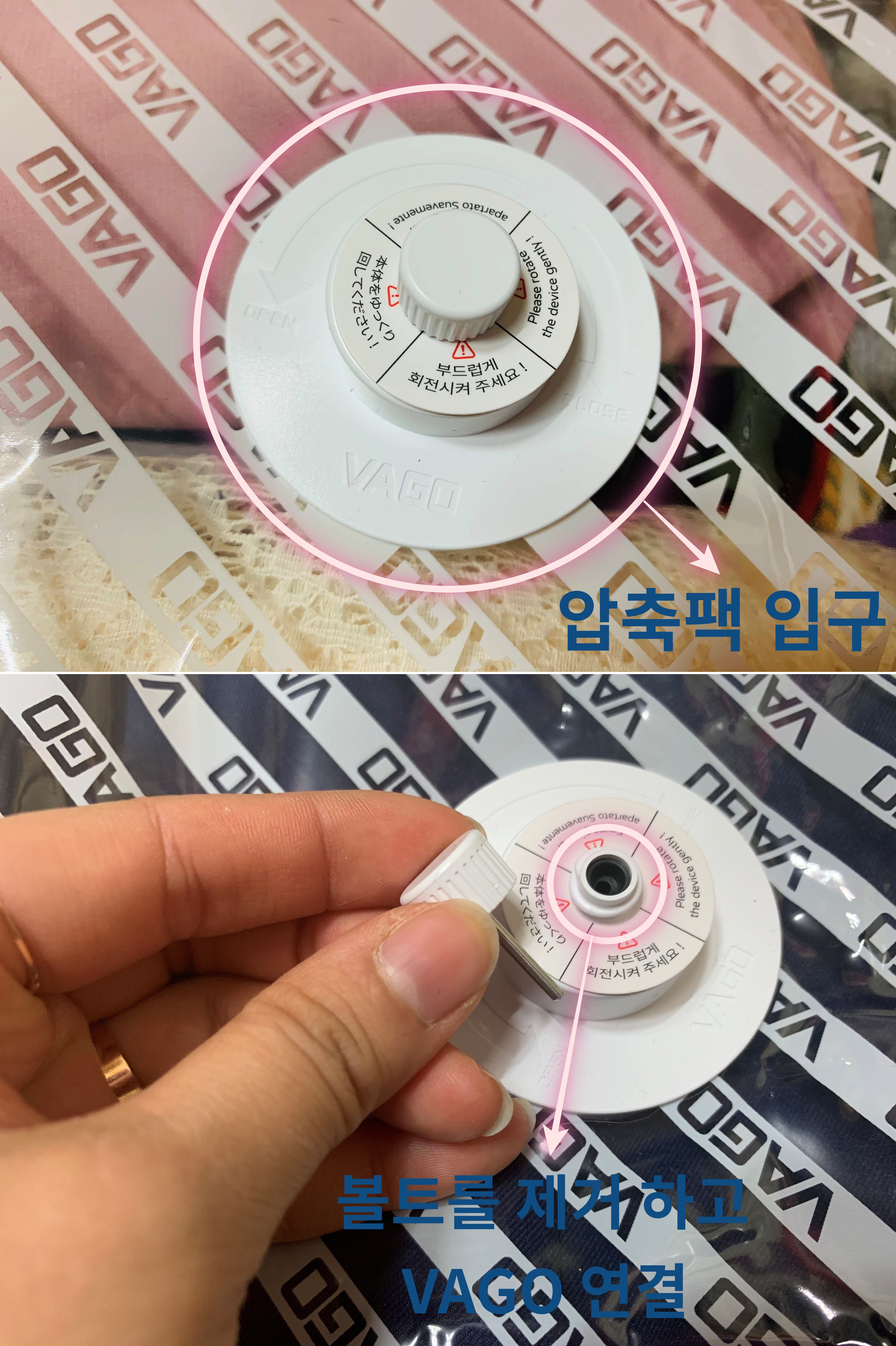 설명서에 나와 있듯이 VAGO를 압축팩 입구에 연결을 했어요.