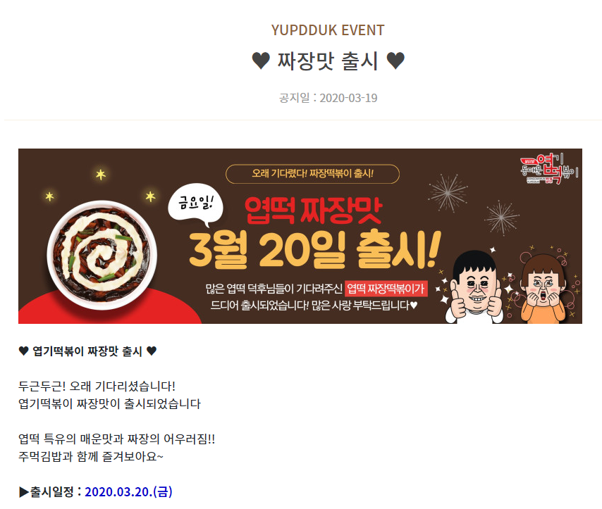 동대문 엽기 떡볶이에서 2020.03.20(금) 바로 오늘 출시를 했어요.