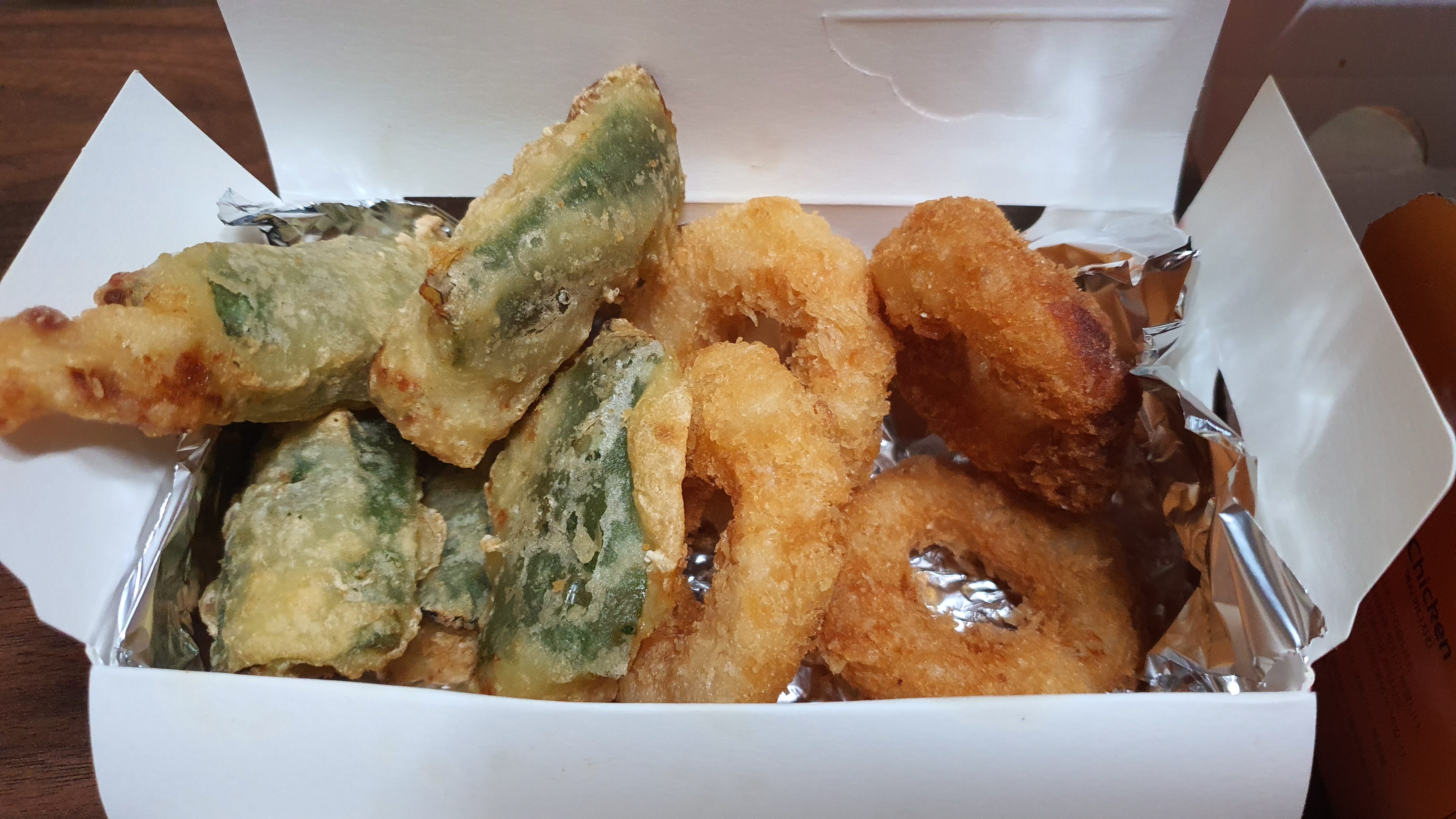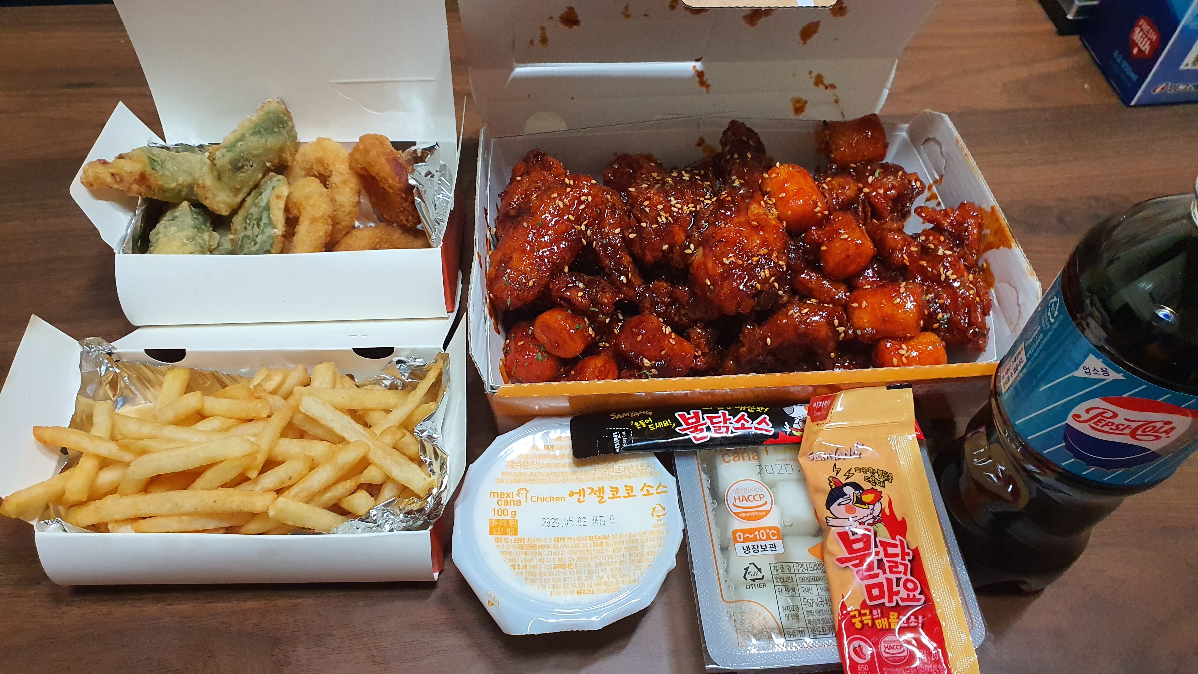 불닭 치킨에 새우링 튀김, 고추 튀김과 멕시 감자도 시켰어요^^
