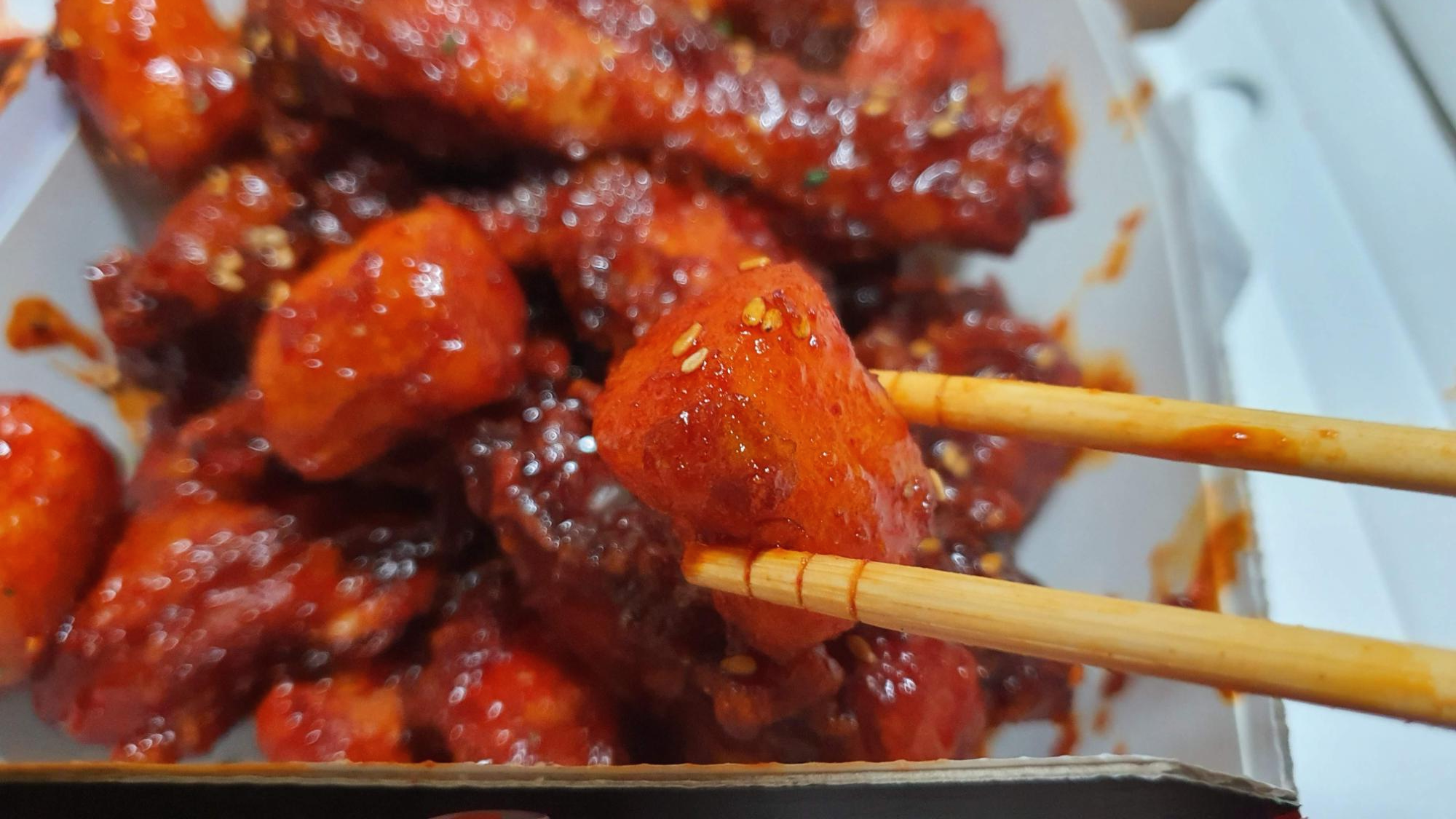 불닭 치킨은 불닭 소스로 잘 양념되어 있고, 떡도 들어 있었어요^^