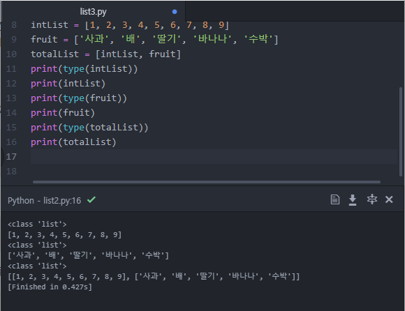 숫자, 문자열, 심지어 리스트 안에 리스트를 담을 수 있고 리스트의 자료형은 리스트라는 것은 변함이 없다.