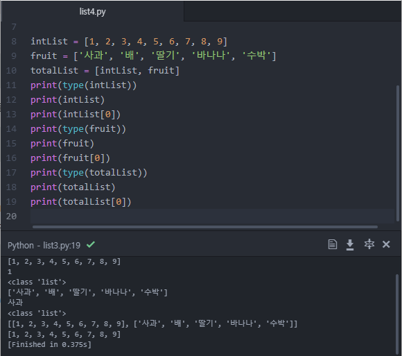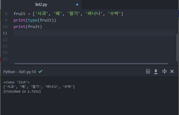 리스트의 생성은 대괄호 '[ ]' 안에 집합의 요소를 넣어주면 된다.