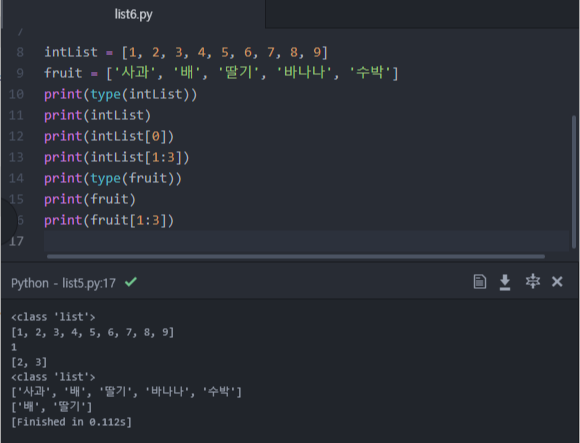 요소를 슬라이싱 해서 보기 위해서는 list [인덱싱 1 : 인덱싱 2] 방식을 사용한다.