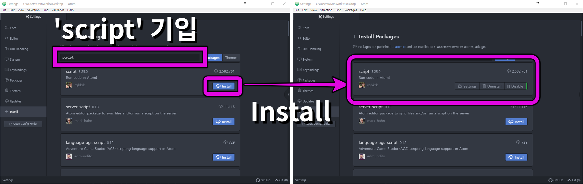 'Search packages'에서 'script'를 검색하여 패키지를 설치합니다.