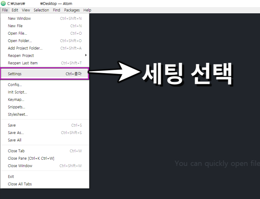 아톰 에디터에서 패키지를 인스톨하기 위해서 메뉴의 'Settings' 창을 엽니다.
