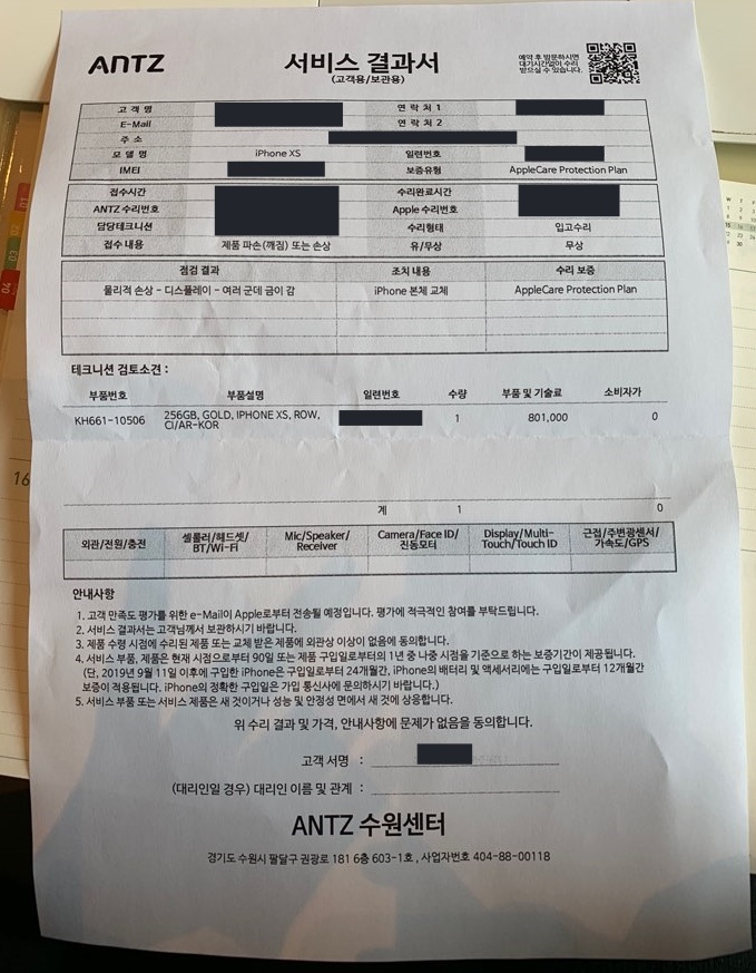 이렇게 해서 편리하게 해외(일본)에서 구매한 아이폰 XS를 애플케어플러스 서비스를 이용하여 AS를 받아 봤어요.