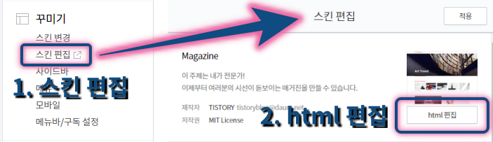 아래의 코드를 적용하기 위해서는 티스토리 설정의 '꾸미기 > 스킨 편집 > html 편집'으로 진입을 해요.