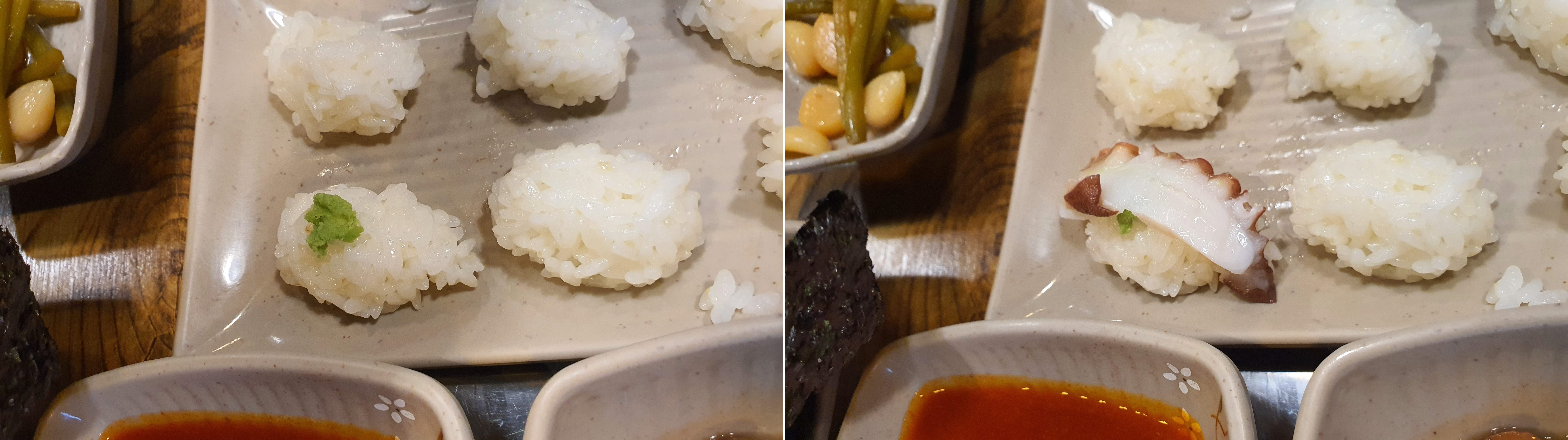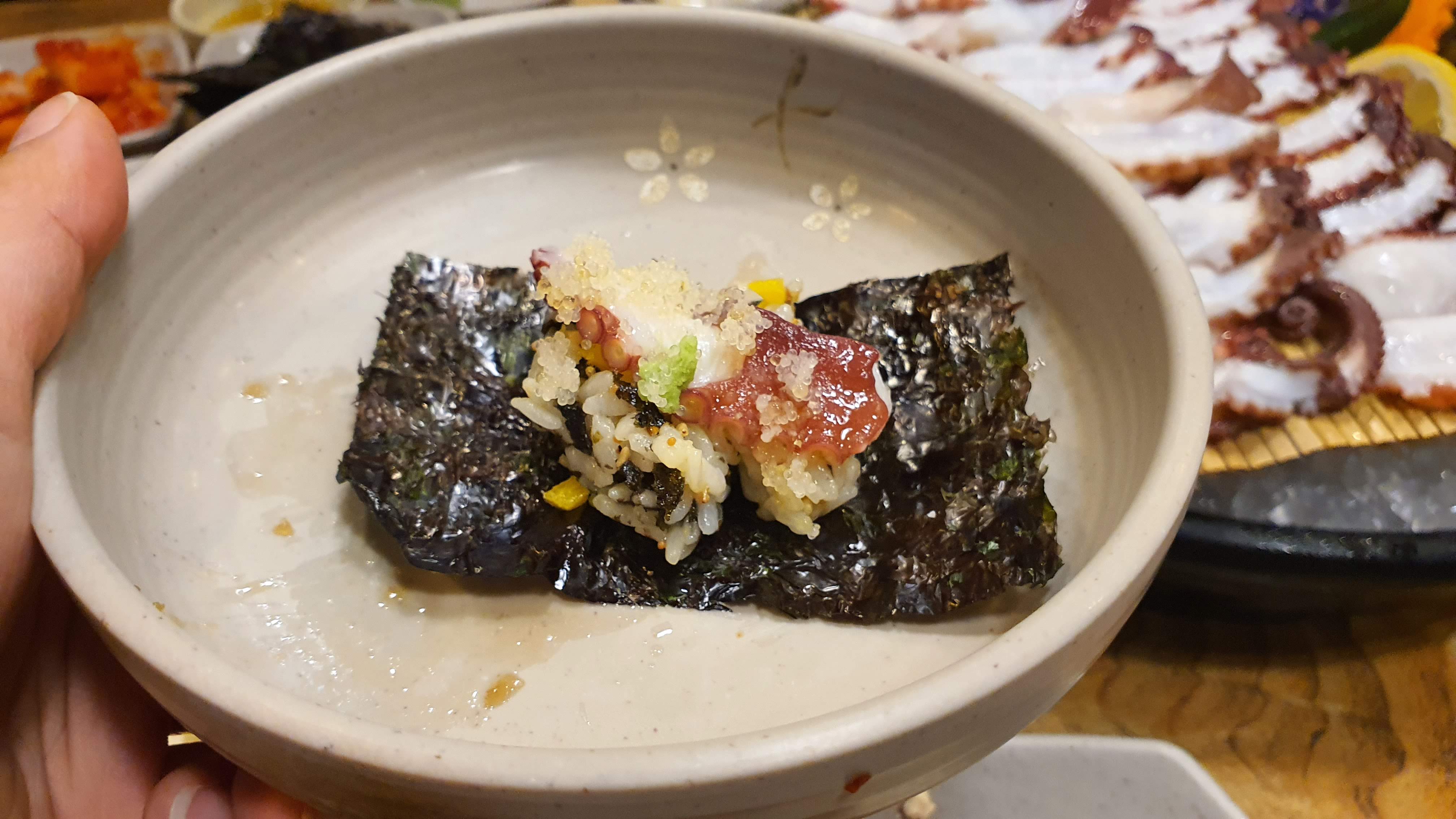 그리고 김에 주먹밥을 조금 넣고 문어를 소금장에 살짝 찍어서 얹고,