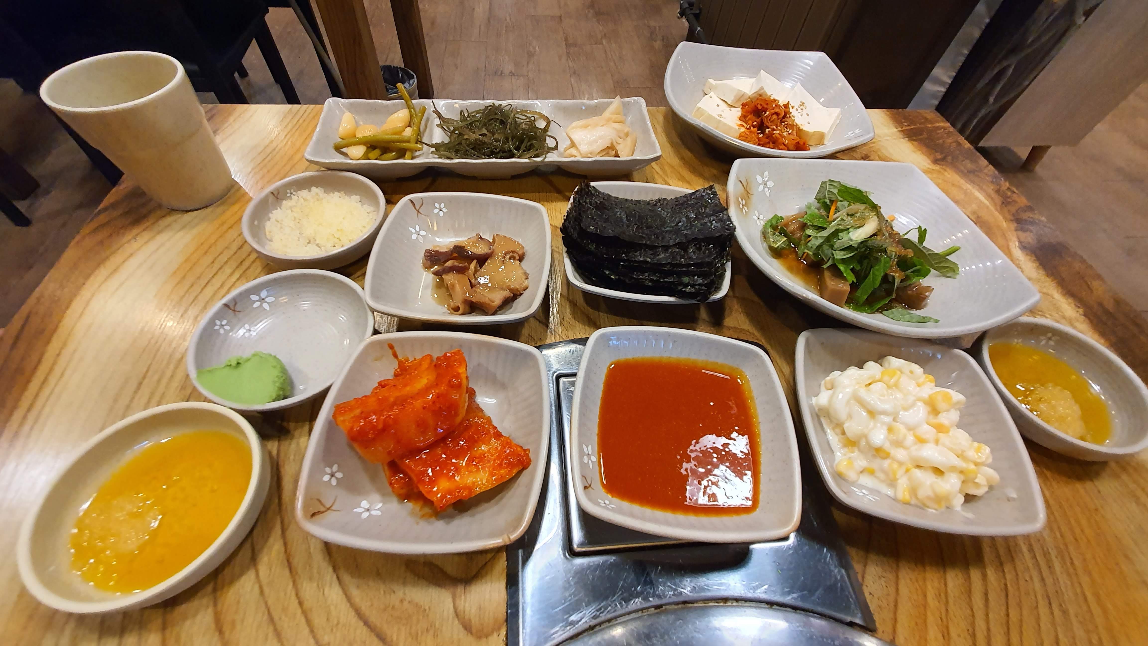반반 세트 A와 해물라면을 주문하니 기본 상차림이 차려지기 시작했어요.