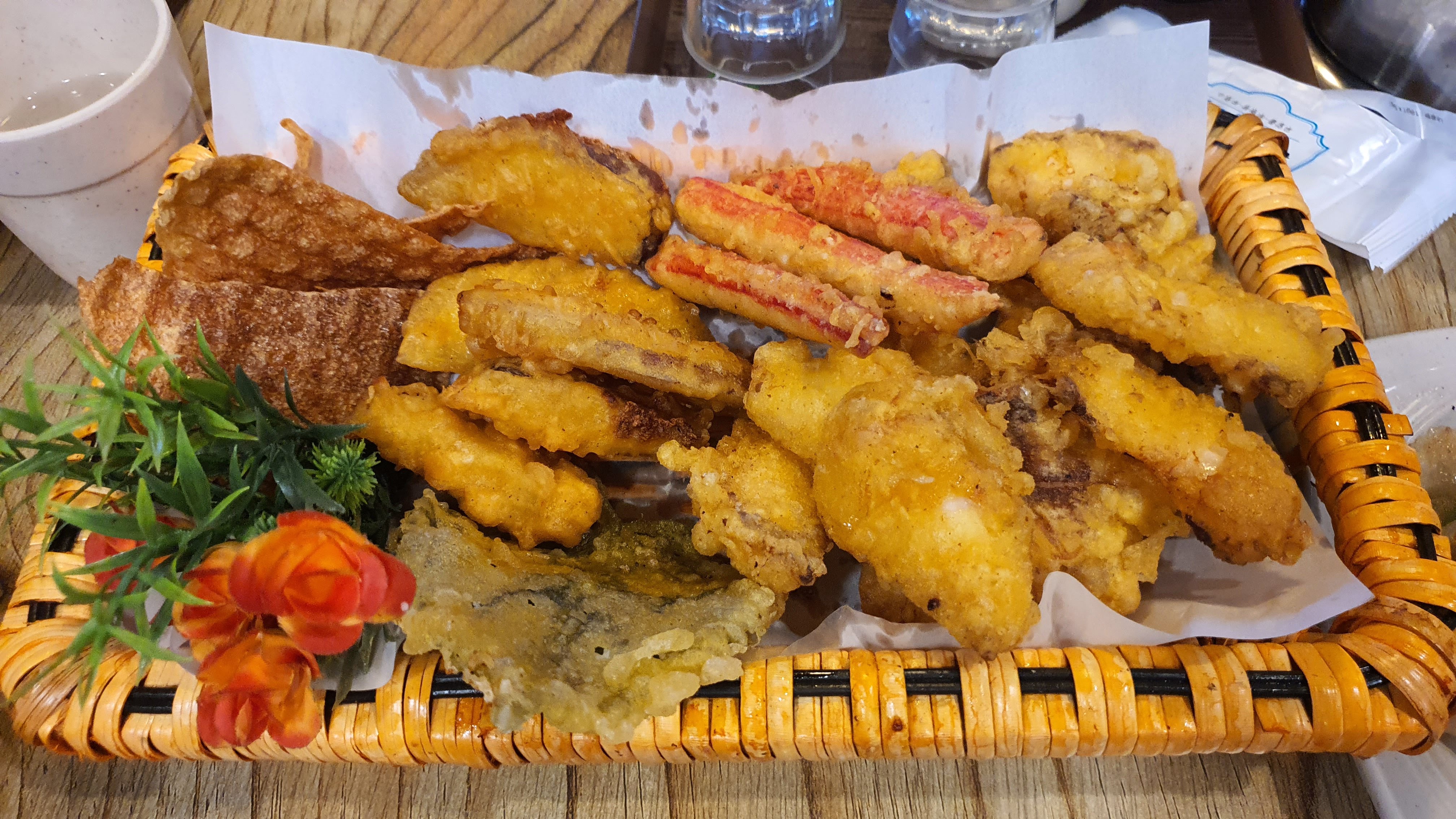 고구마, 맛살, 쥐포, 깻잎, 오징어, 문어 튀김으로 구성되어 있는 튀김