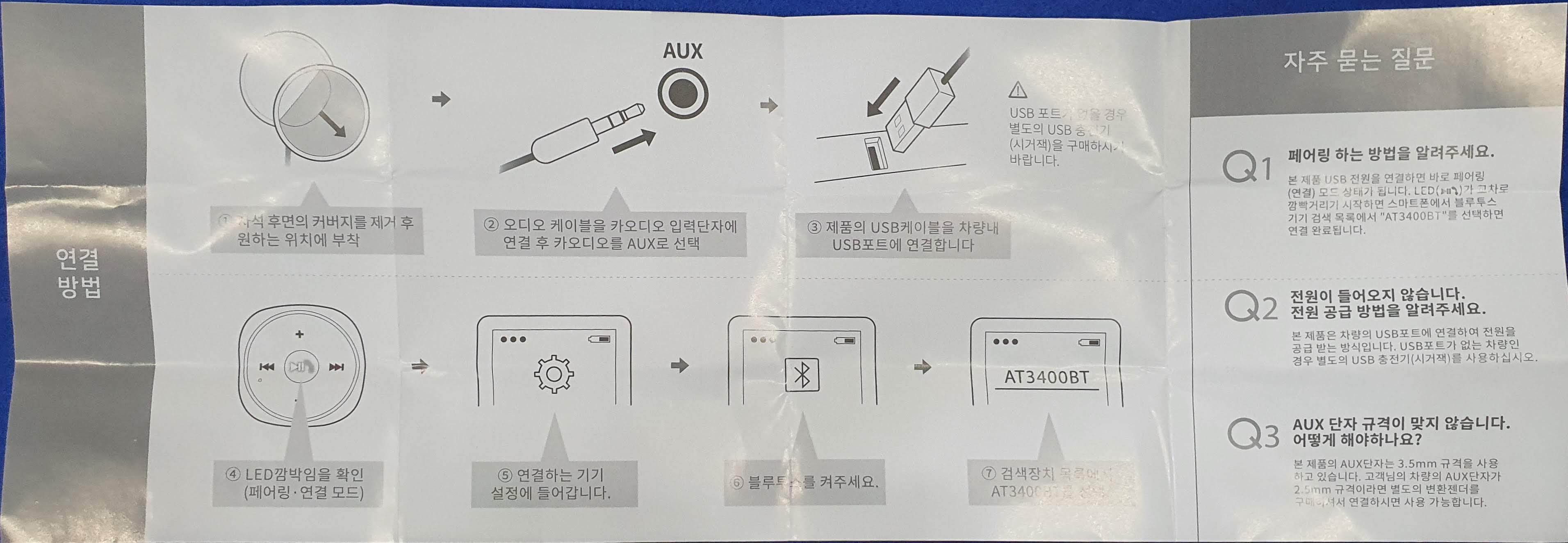 박스 안에는 AT3400BT 제품과 차량에 고정할 수 있는 자석, 메뉴얼이 들어 있어요.