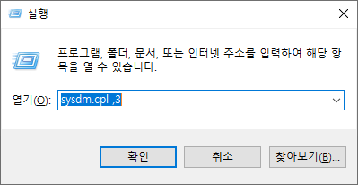 그리고 윈도우 실행창에 'sysdm.cpl ,3'을 입력하고 엔터를 쳐 주면 시스템 속성 창이 열린다.