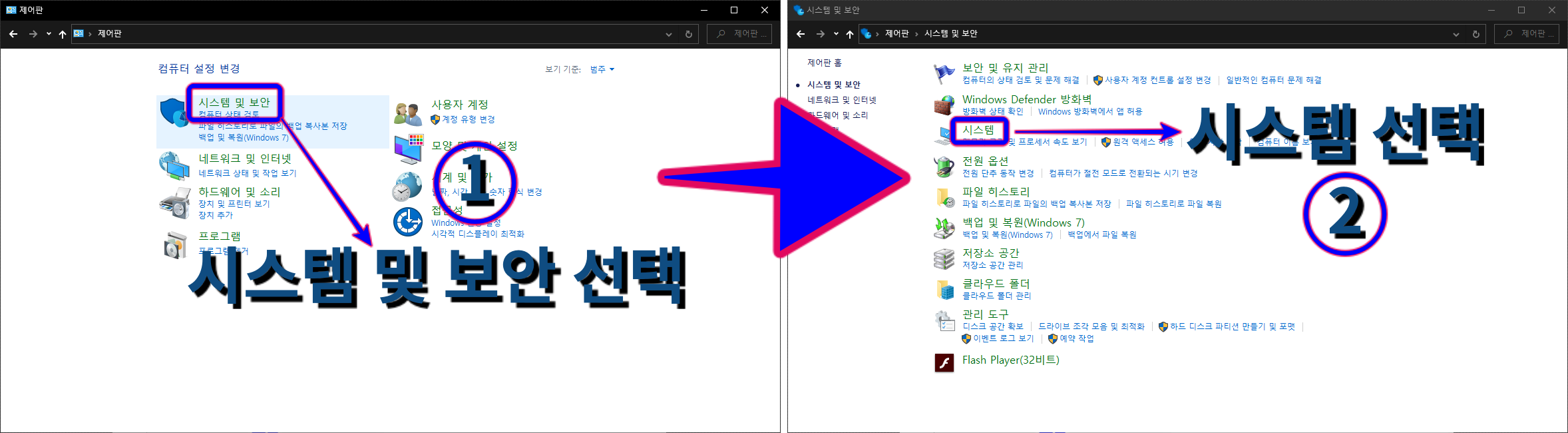 제어판에서 보기 기준이 범주일 때, 시스템 및 보안을 선택하고 시스템을 선택하면 시스템 속성 창이 열린다.