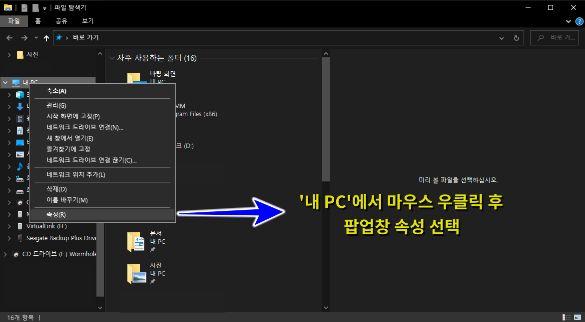 파일 탐색기에서 시스템 환경 변수에 접근 하는 방법은 파일 탐색기에서 '내 PC'에 마우스를 두고 마우스 우클릭을 하면 나오는 팝업 메뉴 창 하단에 '속성'을 선택하면 시스템 속성 창이 열린다.