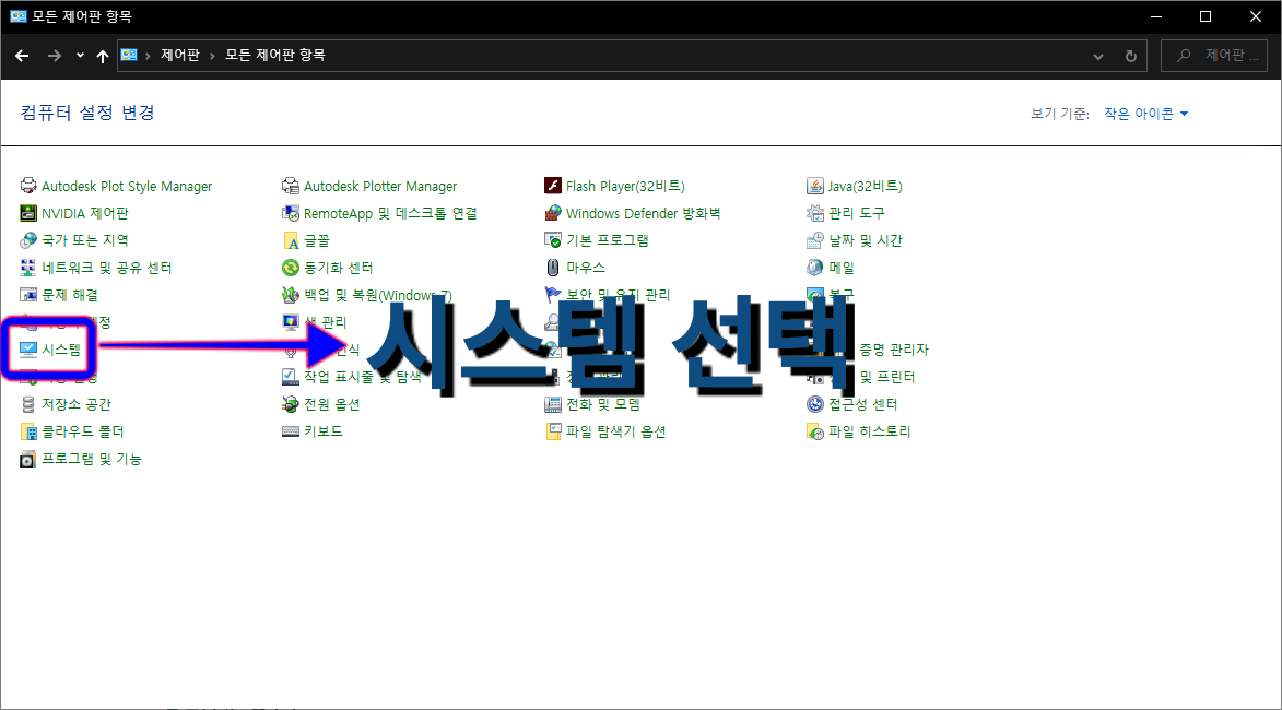 제어판에서 보기 기준이 작은 아이콘일 때, 시스템 아이콘을 선택하면 시스템 속성 창이 열린다.