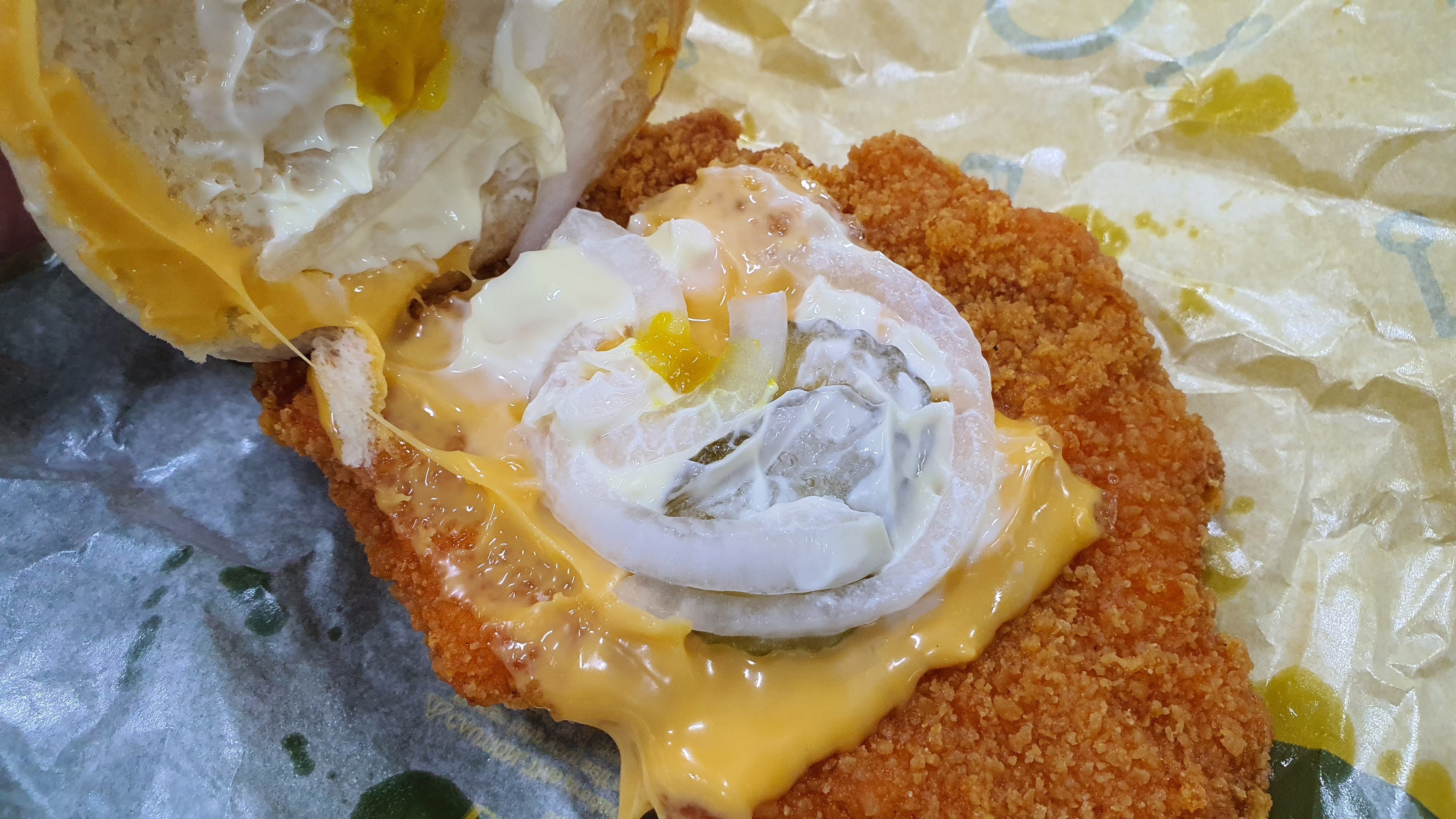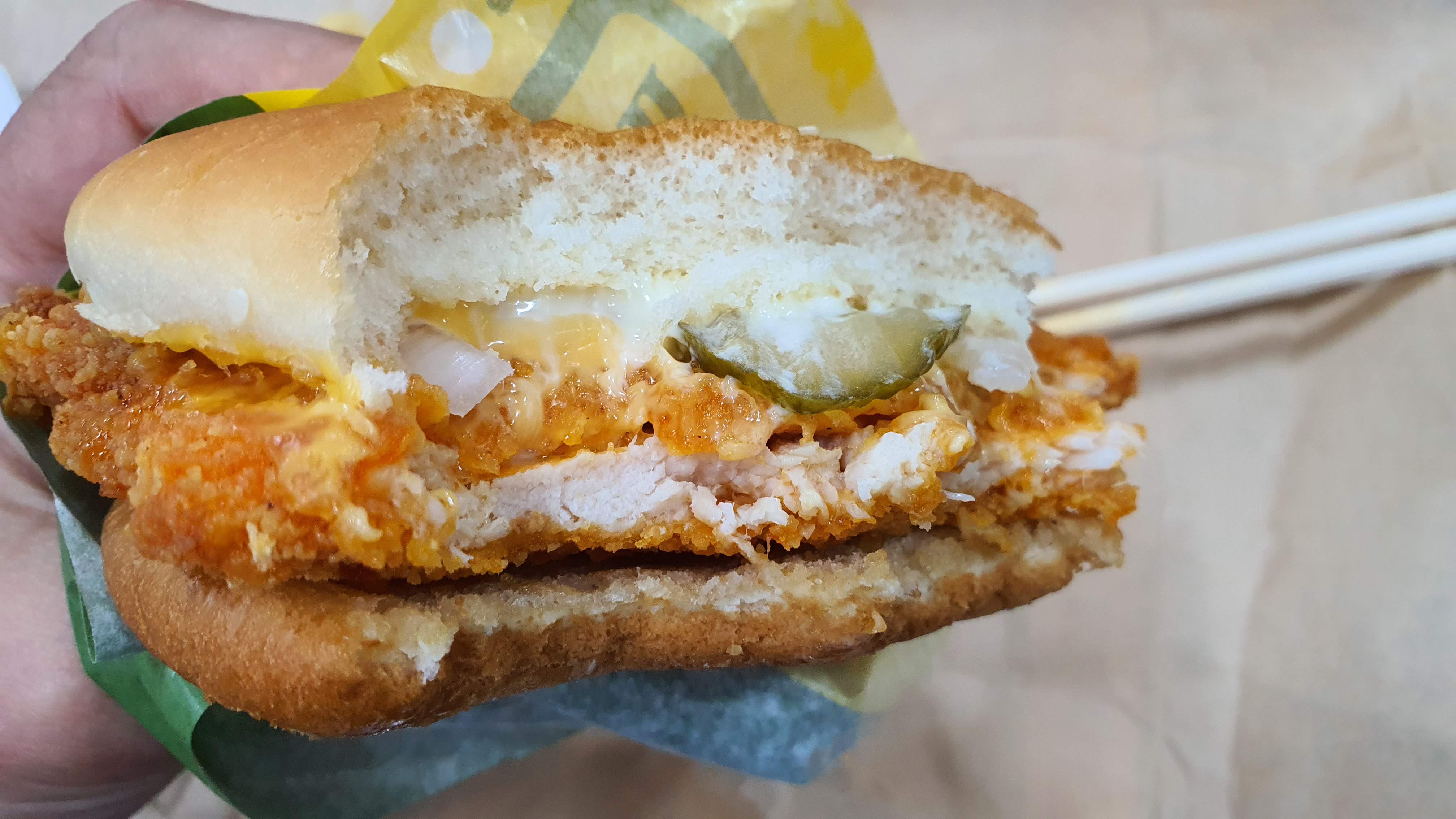 피클, 양파, 치즈, 마요네즈, 머스터드소스가 들어가 있는 거 같아요. 하바네로 맛 지파이라서 매콤한 맛이 나요.