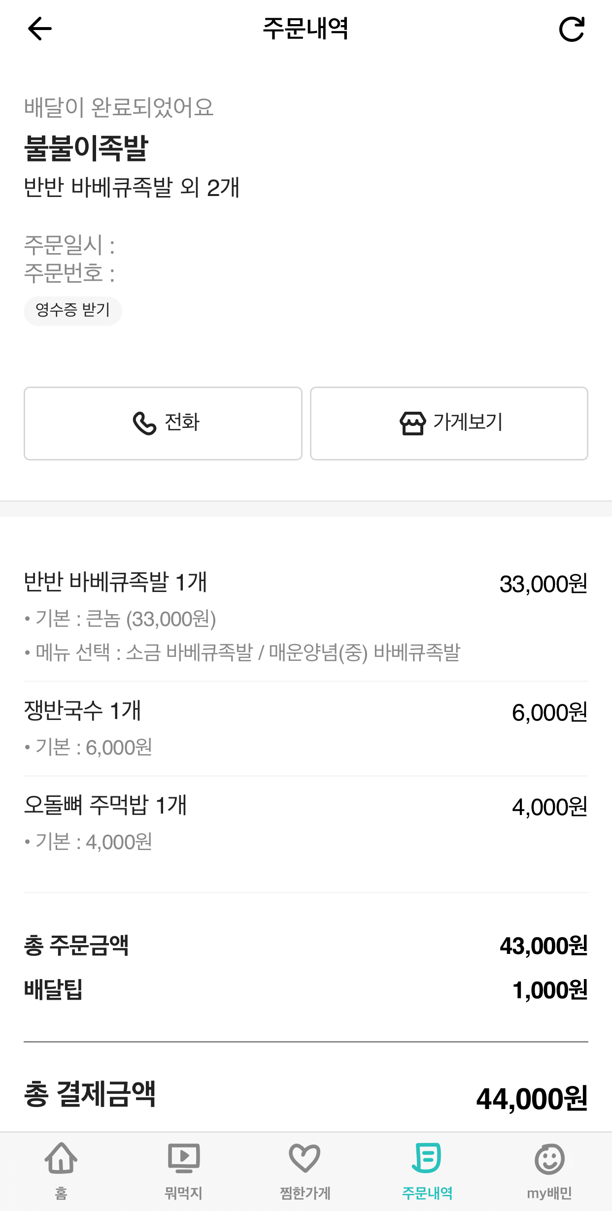 집에서 족발을 시켜먹었어요.