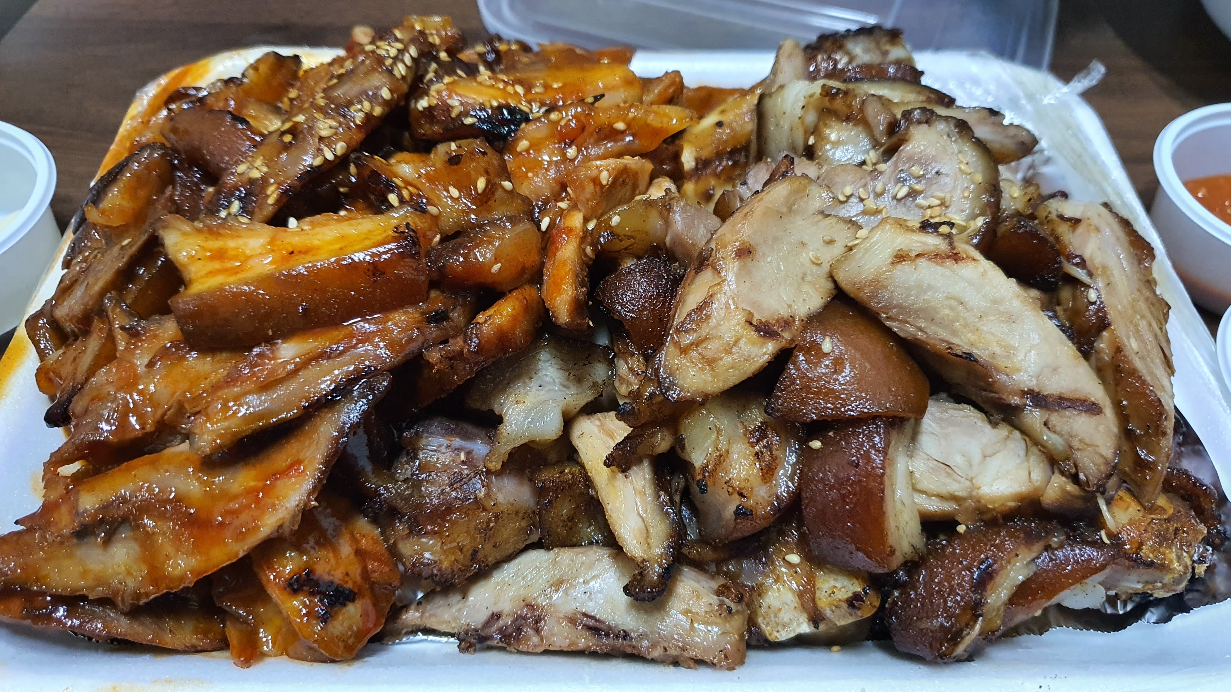 저희는 소금 바베큐 족발, 매운 양념 바베큐 족발로 반반 바베큐 족발을 시켰어요.