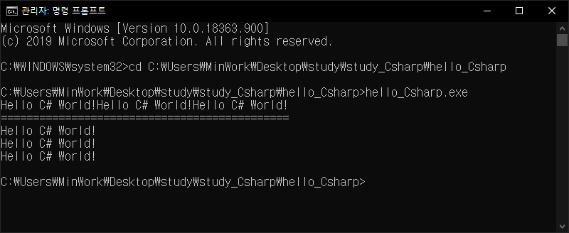 'hello_Csharp.exe'을 명령 프롬프트에서 실행해 보았습니다.