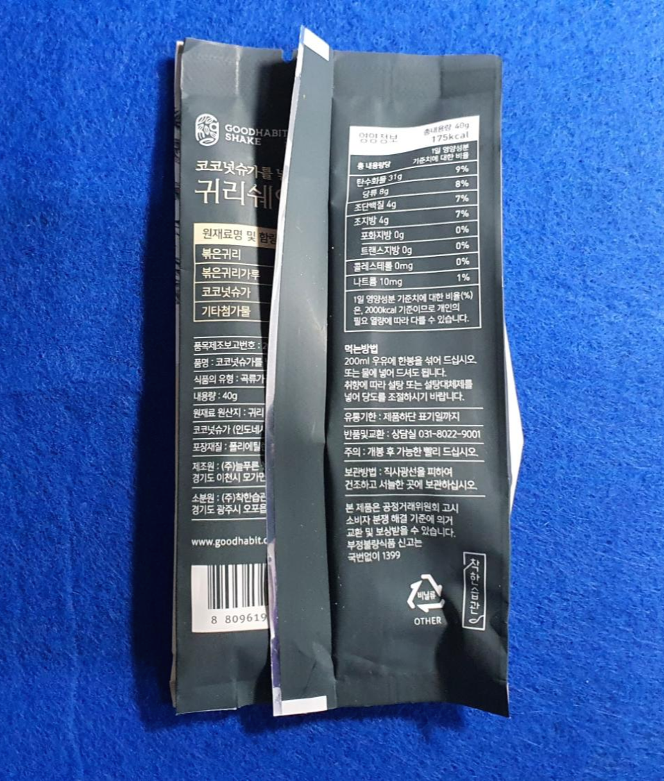 착한 습관 귀리 쉐이크는 40g이고 175kcal입니다.