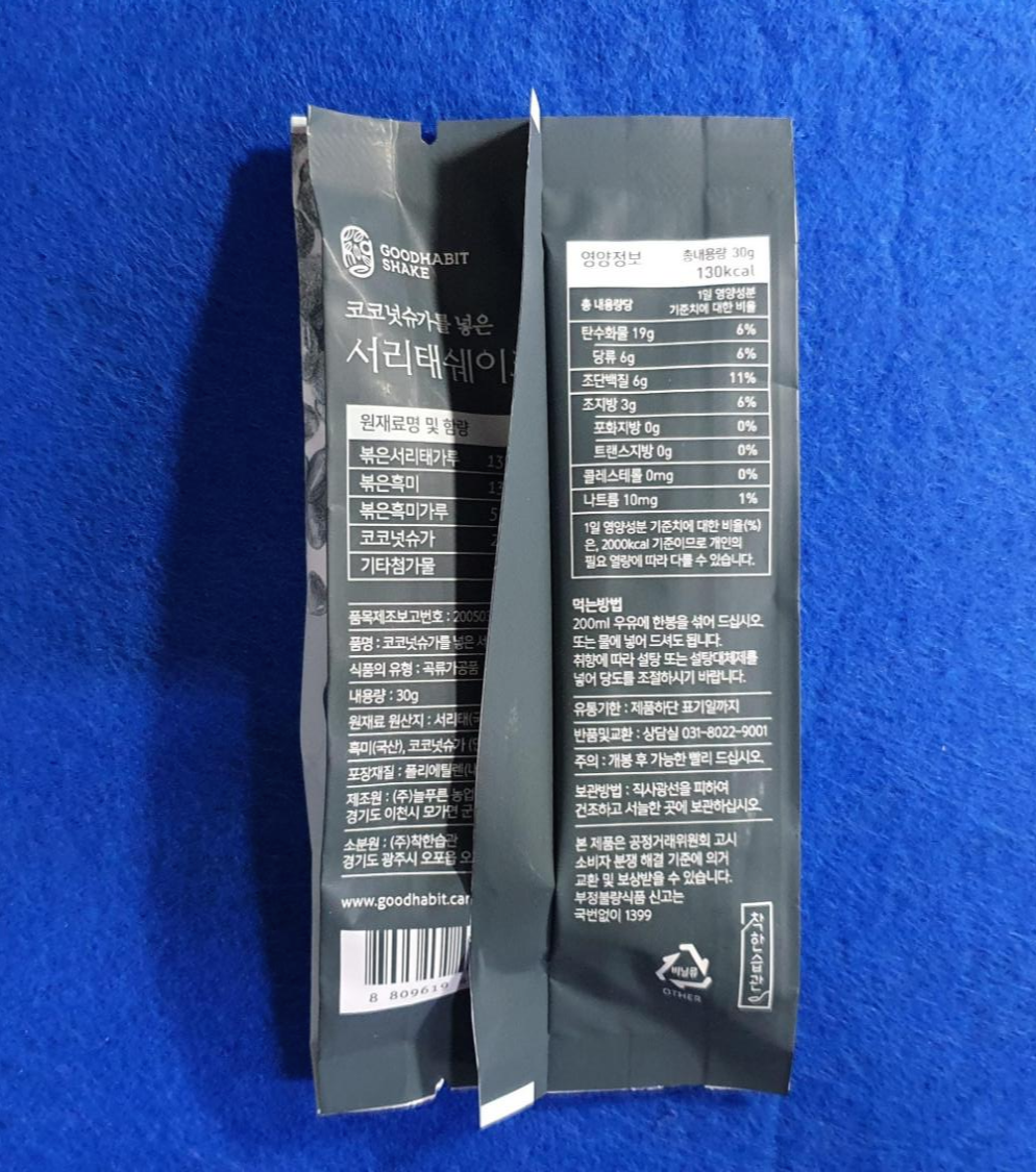 착한 습관 서리태 쉐이크는 30g이고 130kcal입니다.