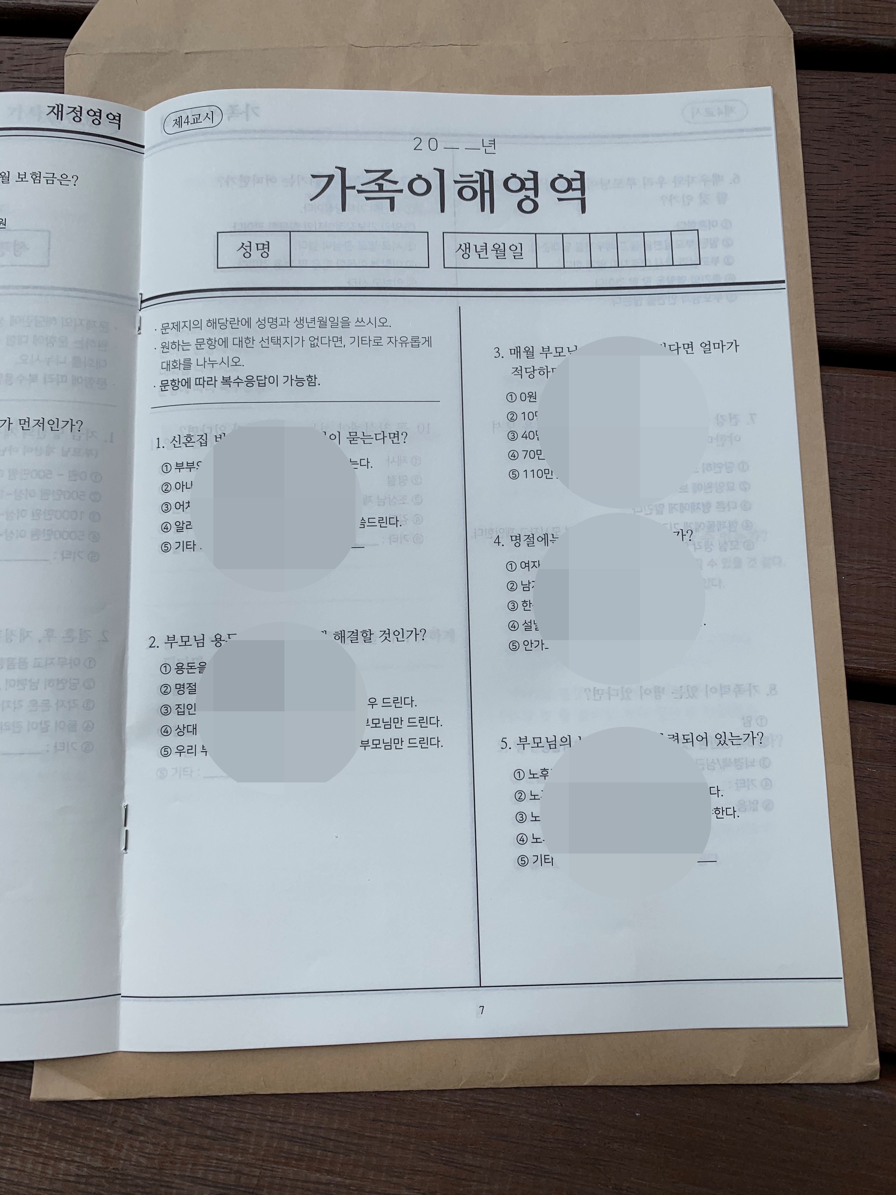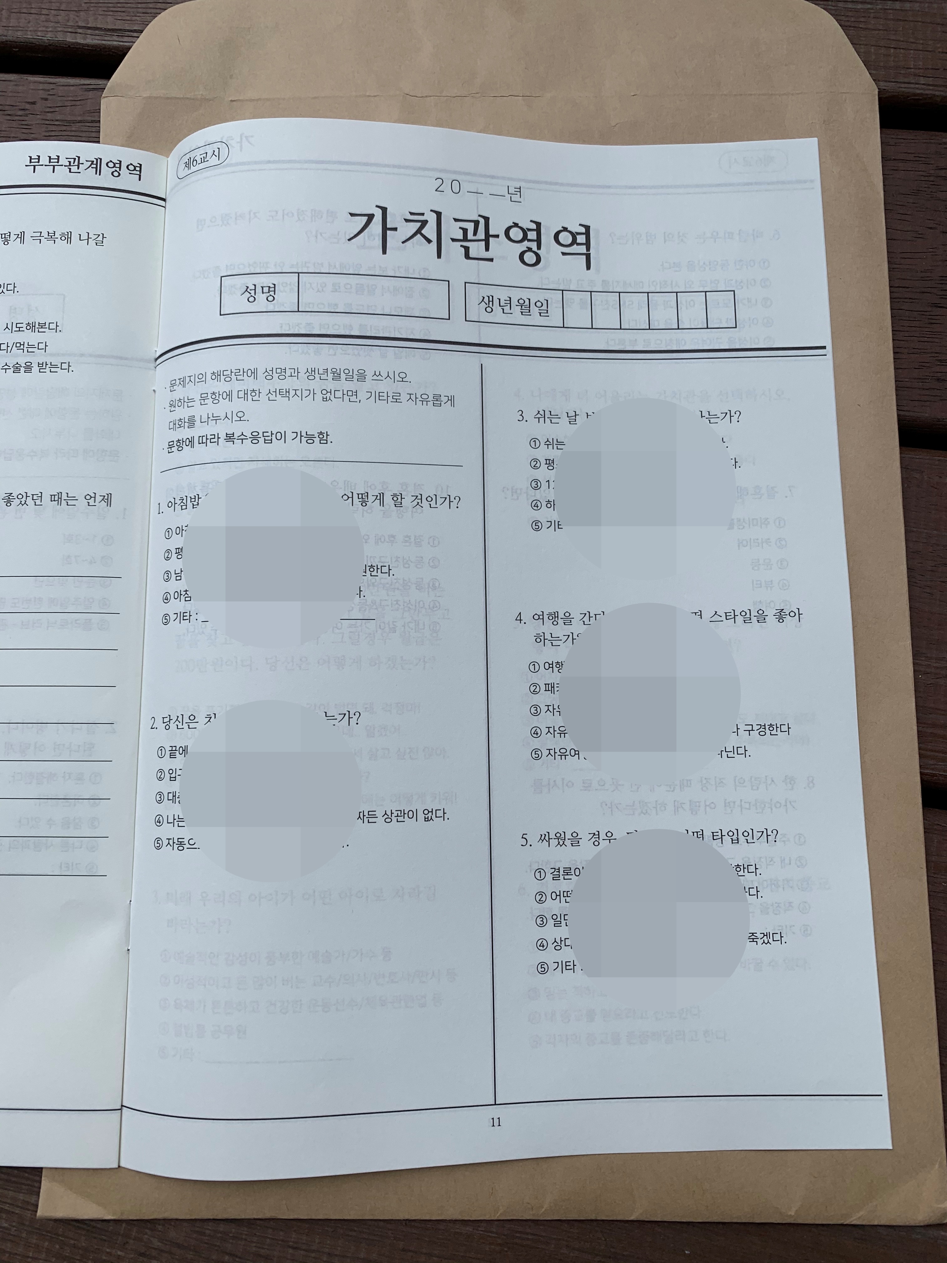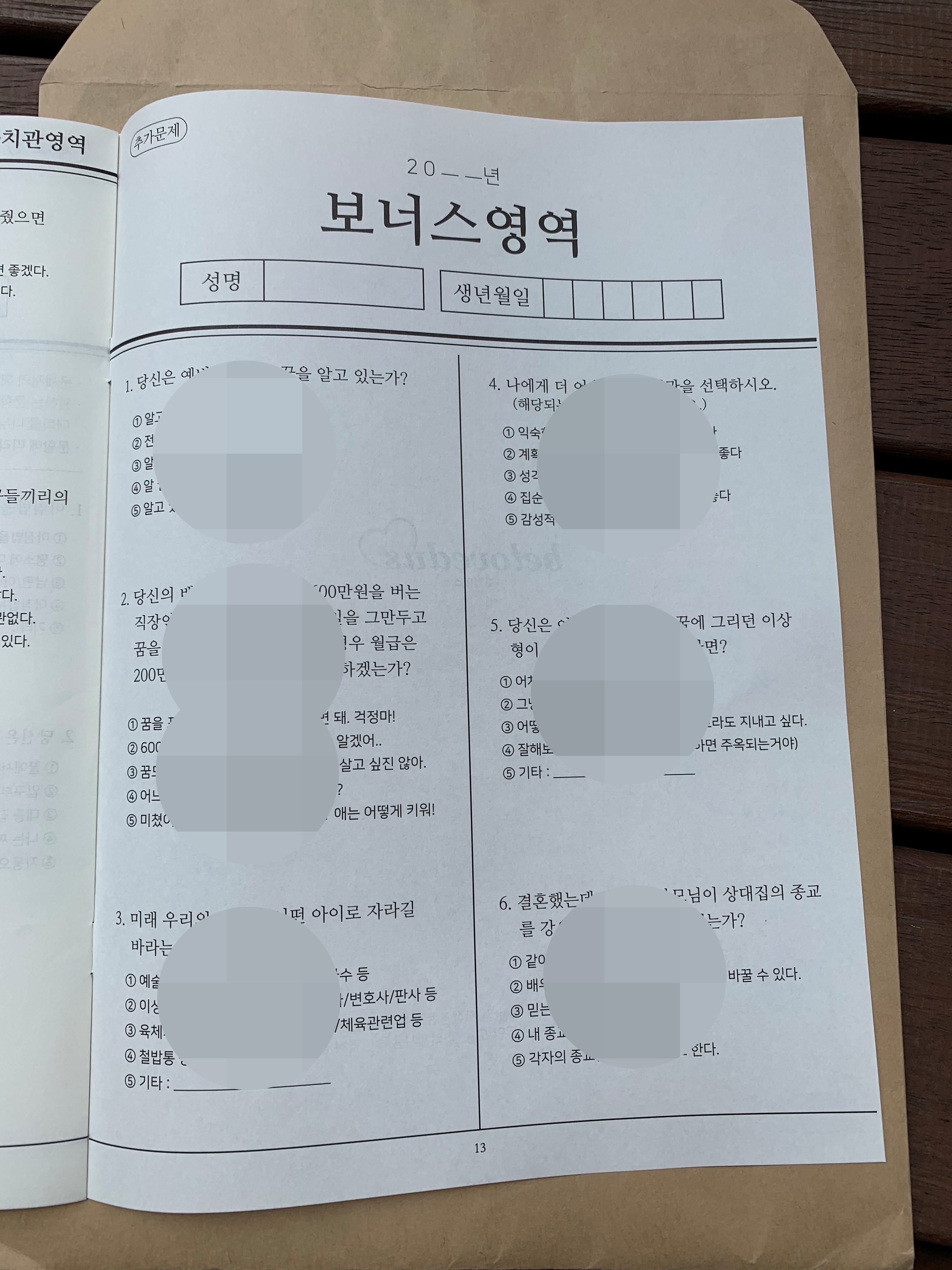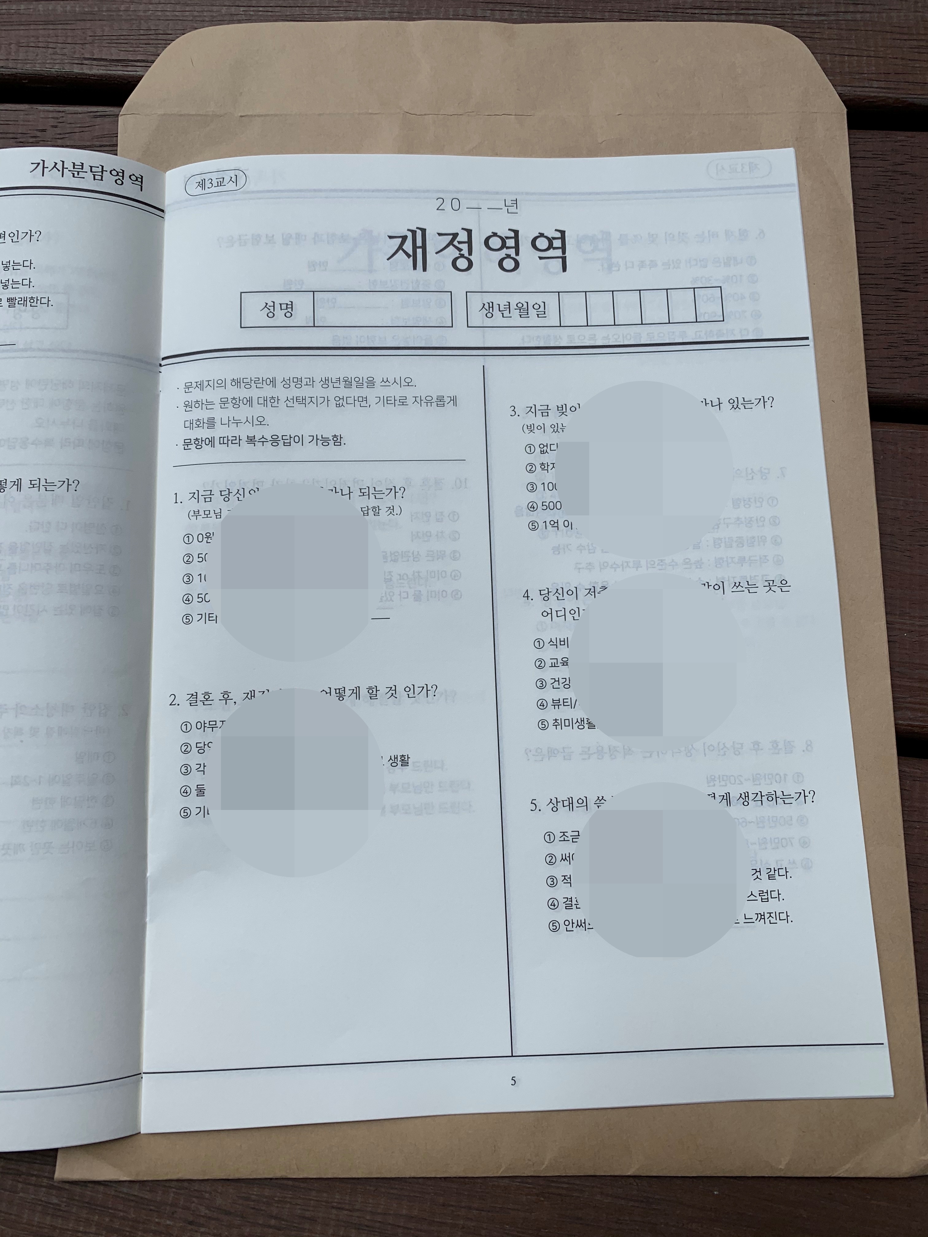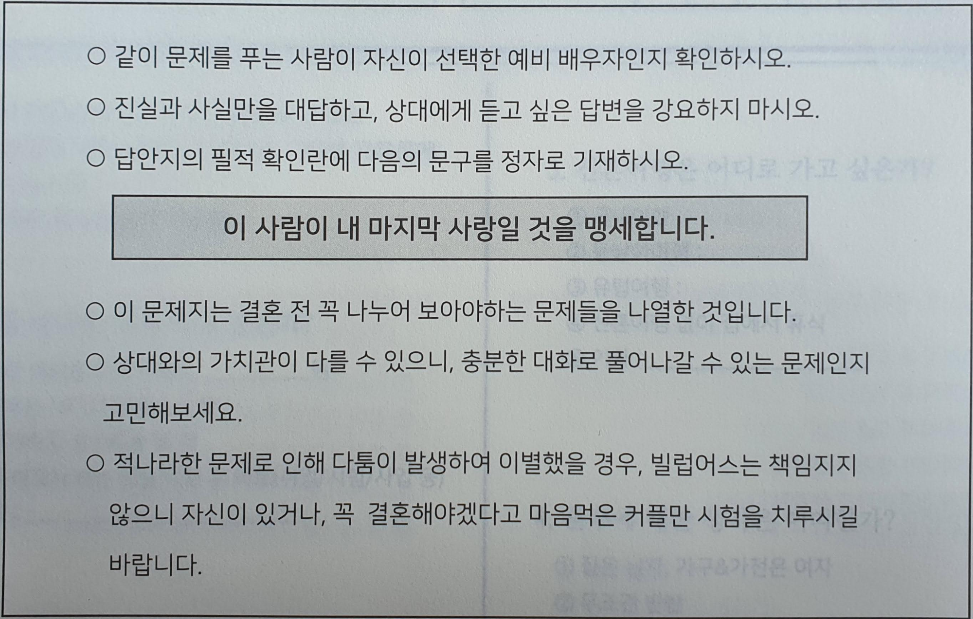 재미로 시작한 '결혼 고사'였지만, 나름 서로에게 묻기 민감한 부분들을 접근하기 쉽게 해주는 것 같았어요. 모든 문제는 오지선다형이었어요. 하지만 저희는 풀면서 예시에 없는 문제들에서는 주관식처럼 서로의 의견을 적었어요.