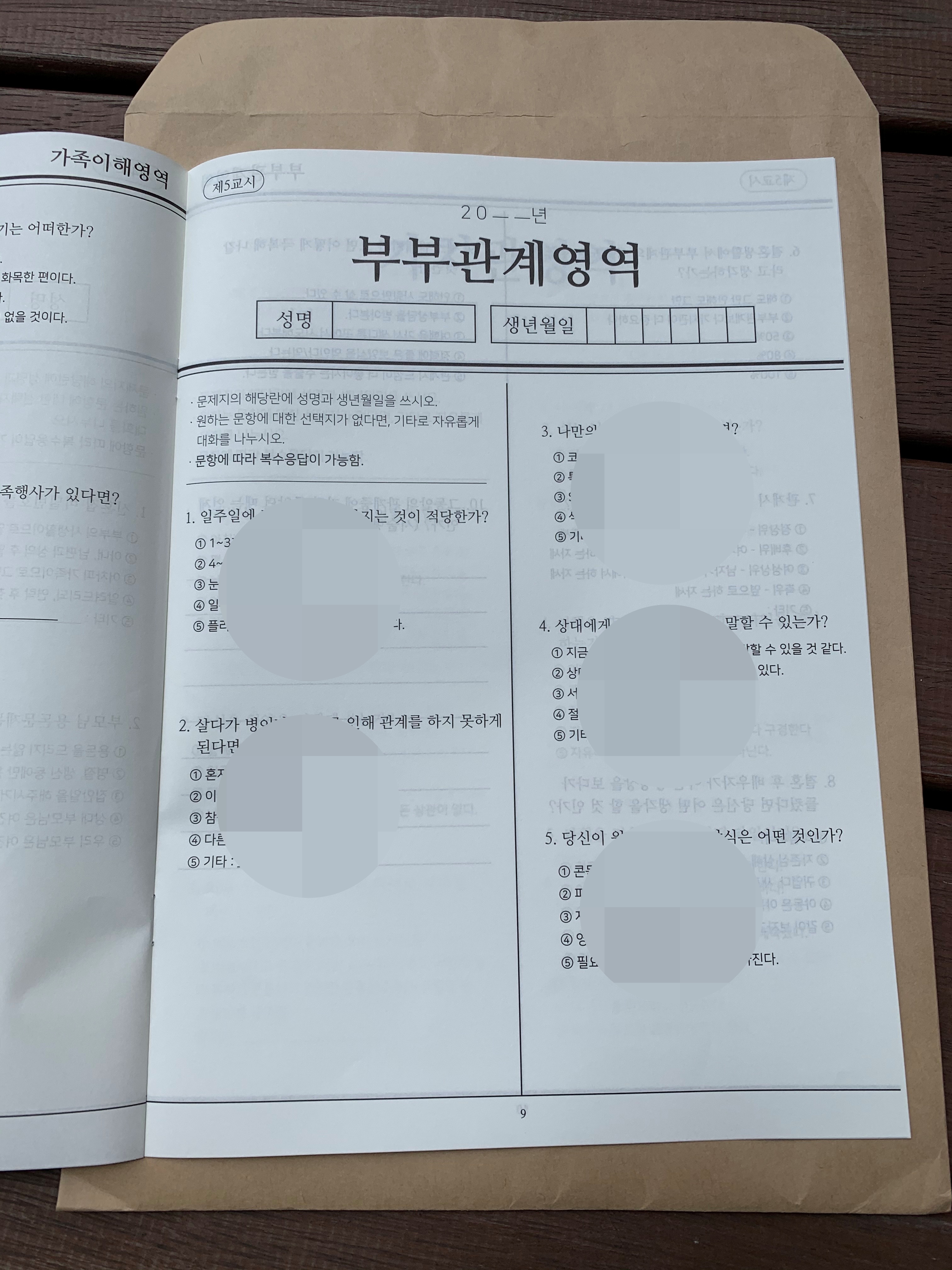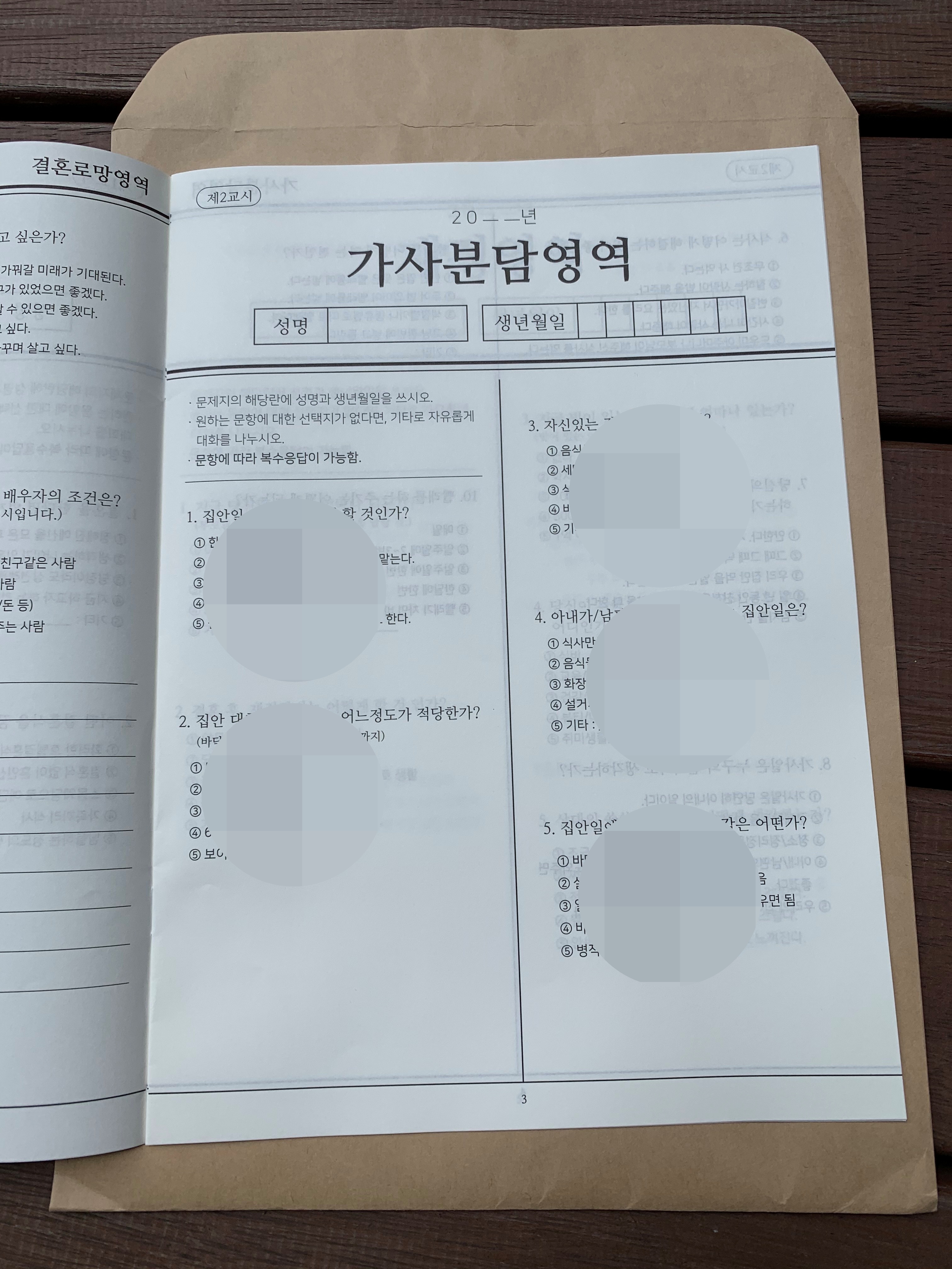 결혼 고사에는 두 개의 시험지와 OMR 카드 두장이 들어 있었어요.