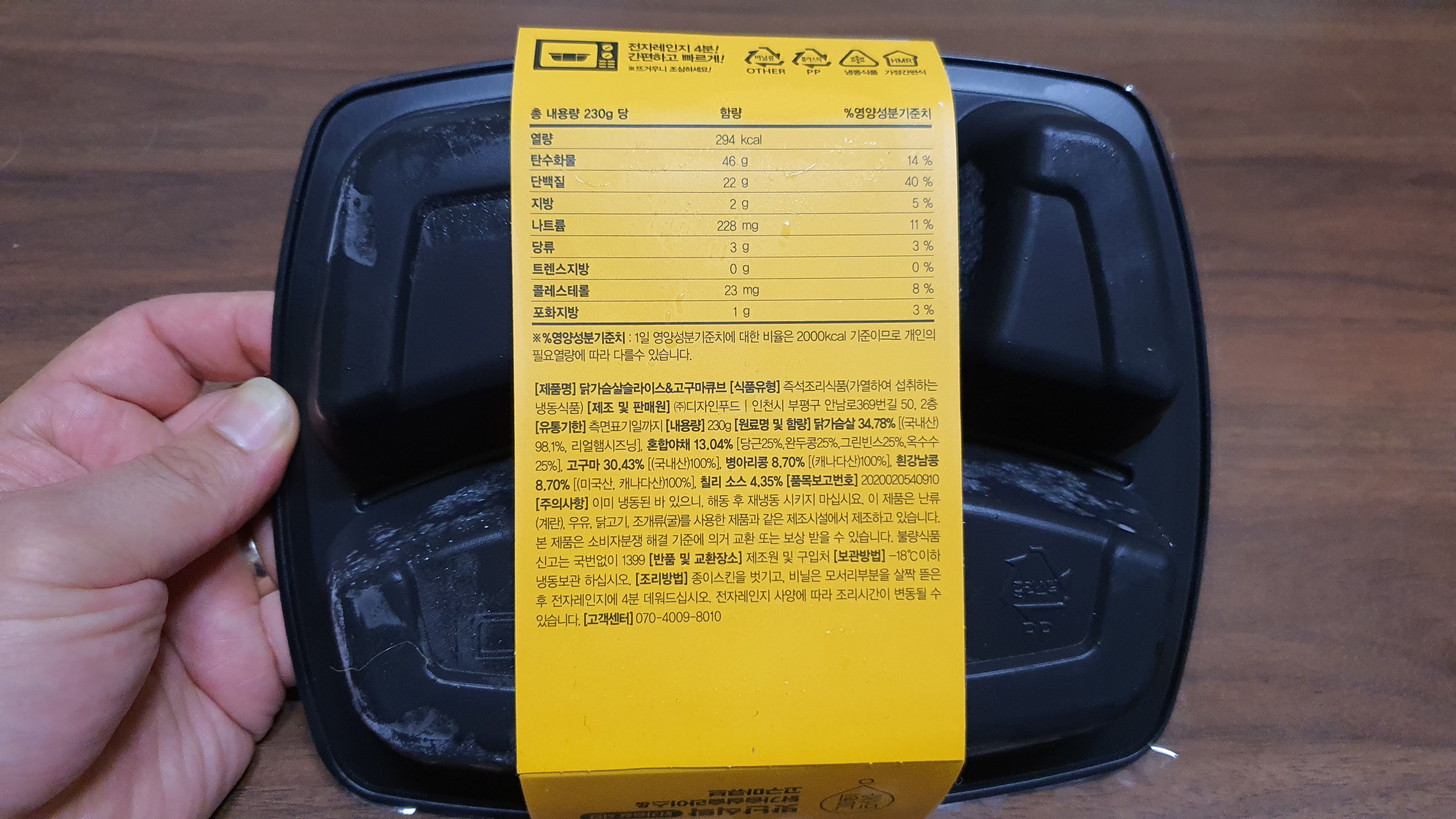 양이 푸짐하지는 않지만, 이번에는 진정한 다이어트 식사인 거 같아요. 그전 맛난식탁에는 밥이 있어서 생각보다 포만감이 좋았는데요. 이번에는 다이어트의 전매특허라고 할 수 있는 닭가슴살과 고구마로 구성이 되어서 그런지 기분 탓으로 배가 안 차는 거 같았어요. ㅋㅋㅋ 그래도 전자레인지에 돌려서 간단하게 먹을 수 있고 과식을 막을 수 있어서 좋아요. 저는 요즘 이것을 자주 먹어요. 아주 편해서 더욱 거르기 쉬운 끼니를 잘 챙기는 거 같아요. ㅎㅎㅎ 그리고 한 끼 식사로 여러 영양소를 섭취하는 것 같아서 좋아요.