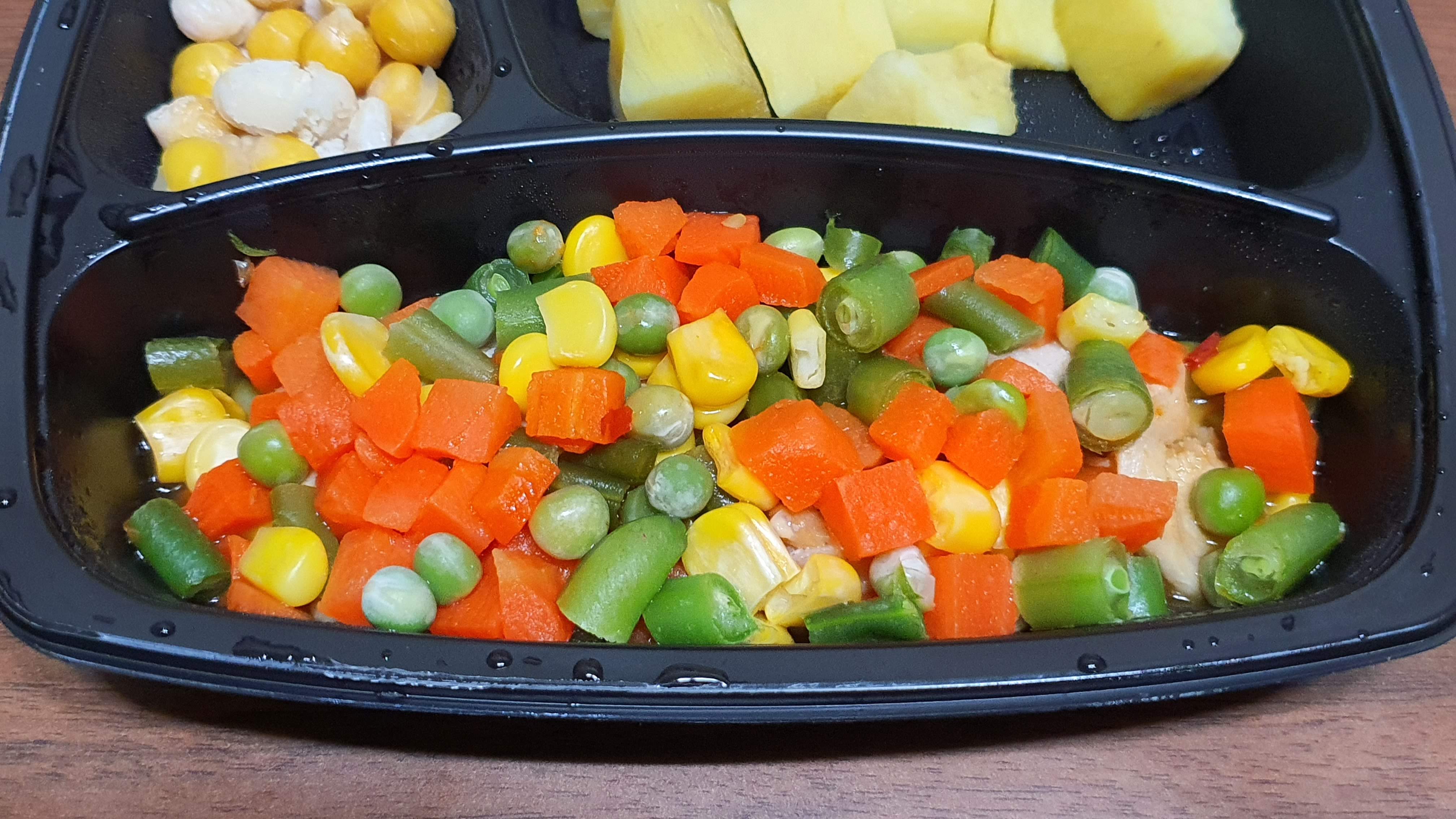 당근, 완두콩, 그린빈스, 옥수수에 덮여 있는 닭가슴살이에요.