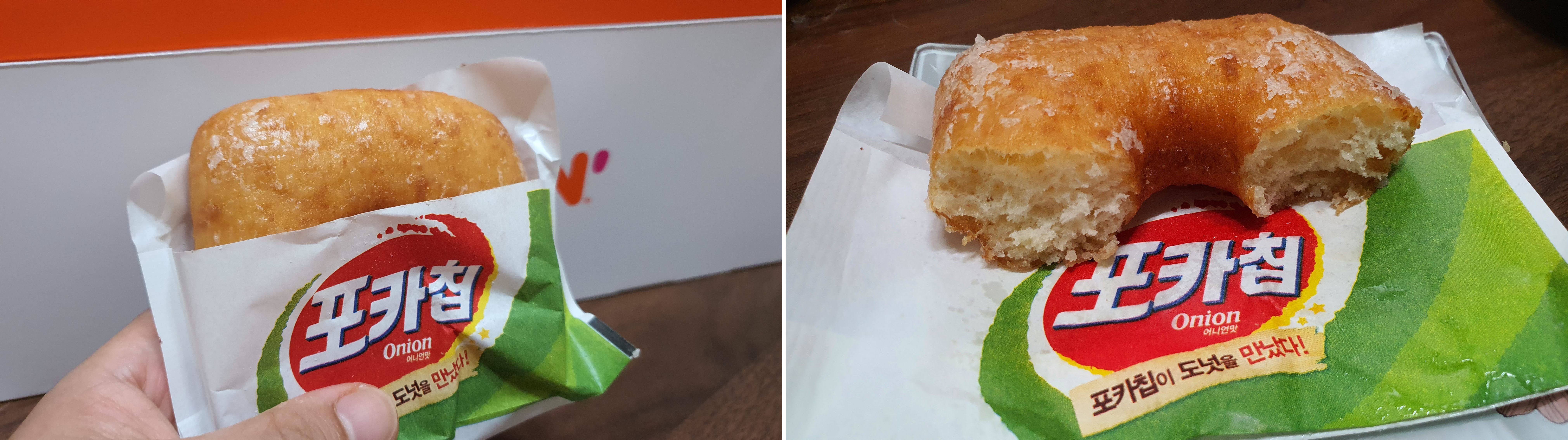 도넛에서 포카칩 맛이 살짝 나요. ㅎㅎㅎ 빵을 먹는데 과자 맛이 나요. 그렇지만 포카칩의 맛이 강하지는 않아서 그렇게 확 와 닿지는 않았어요.