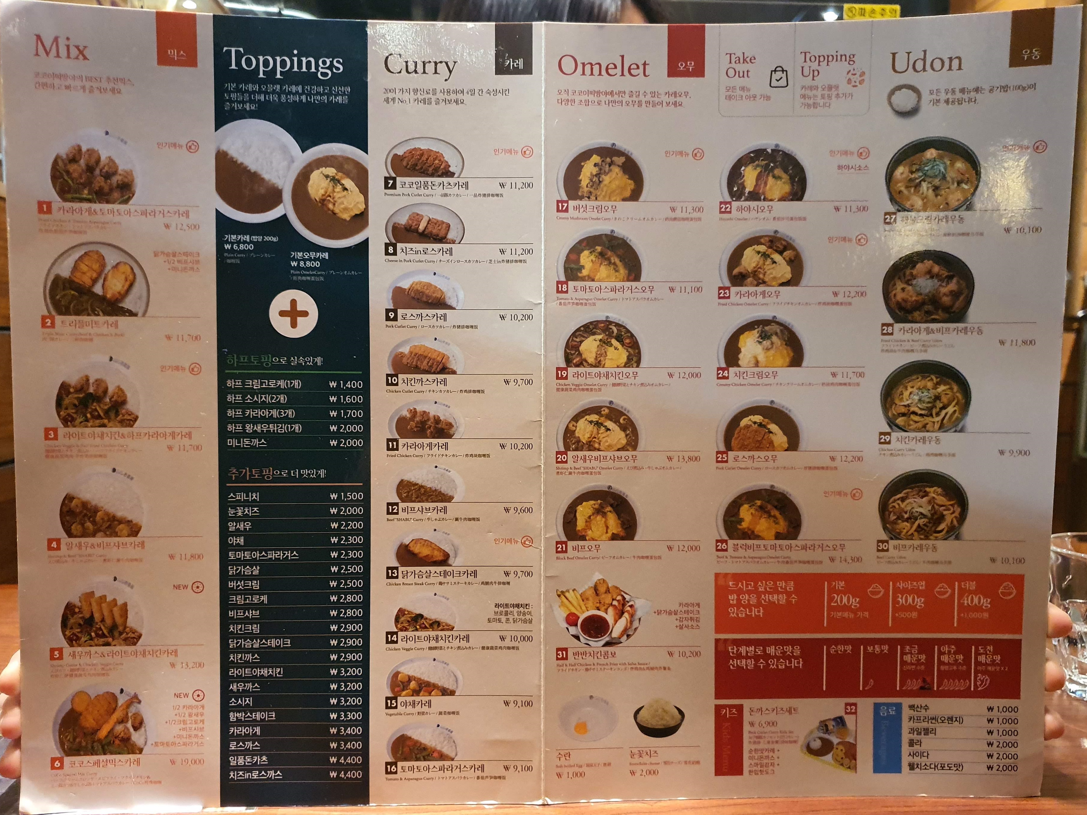 저희는 코코일품돈카츠카레(200g, 보통맛), 버섯크림오무(조금매운맛), 해물크림카레우동을 시켰어요.
