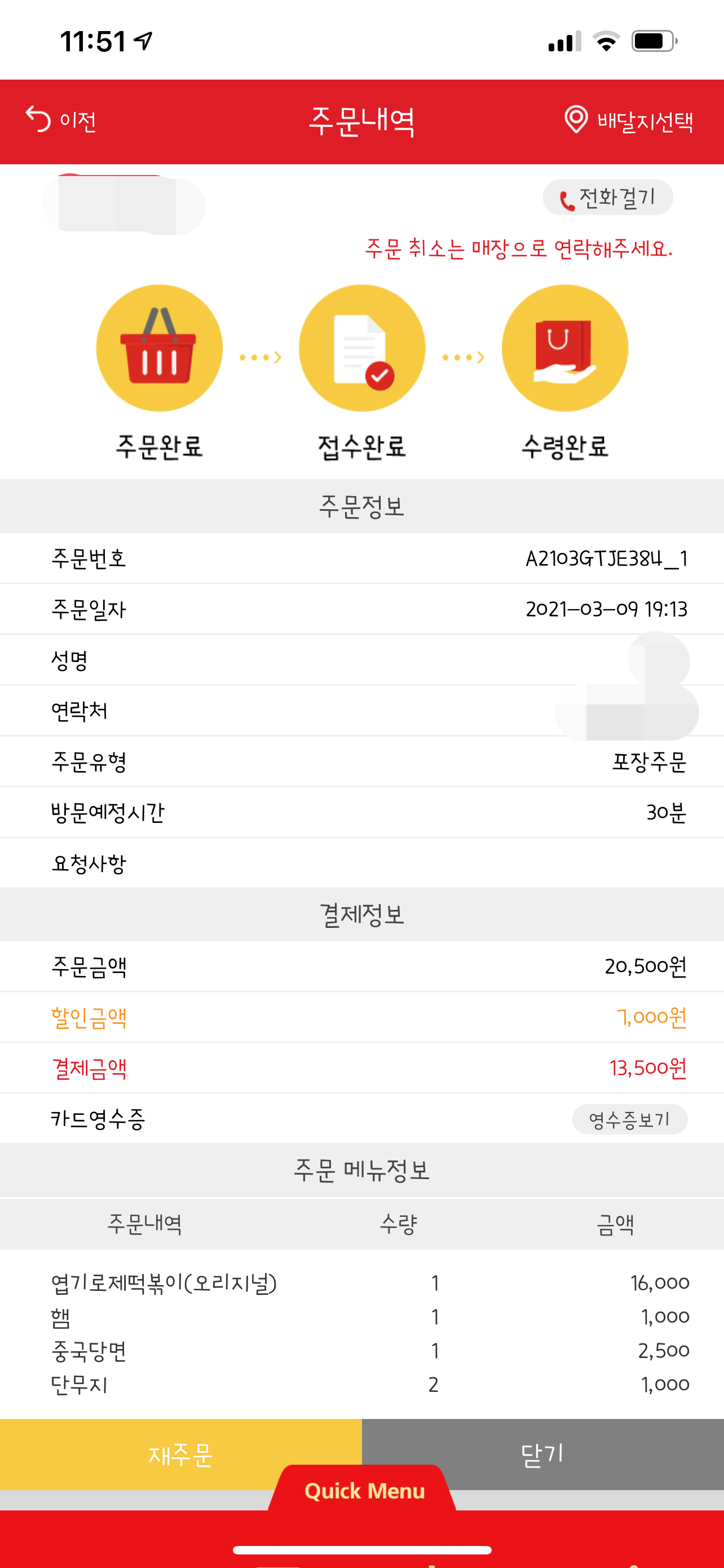 포장 주문을 완료하니 바로 가게에서 전화가 왔는데요. 주문이 많아서 40분 정도 걸린다고 하더라고요.