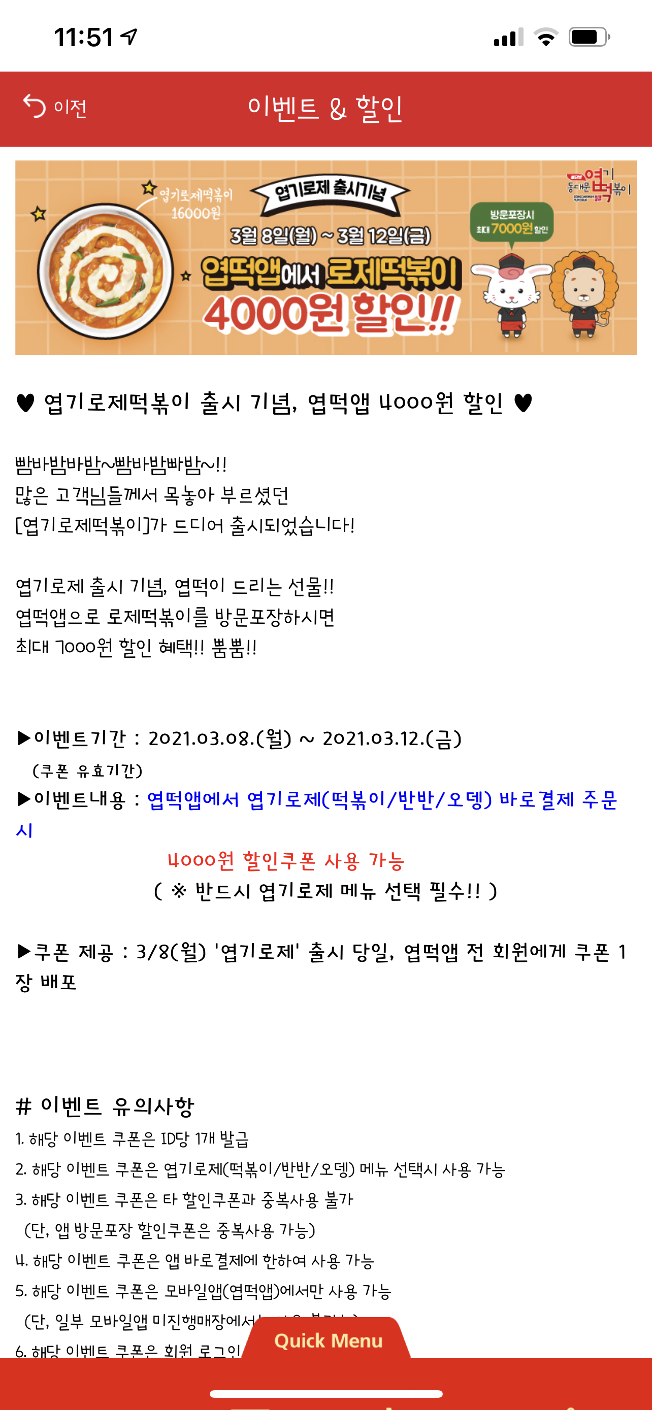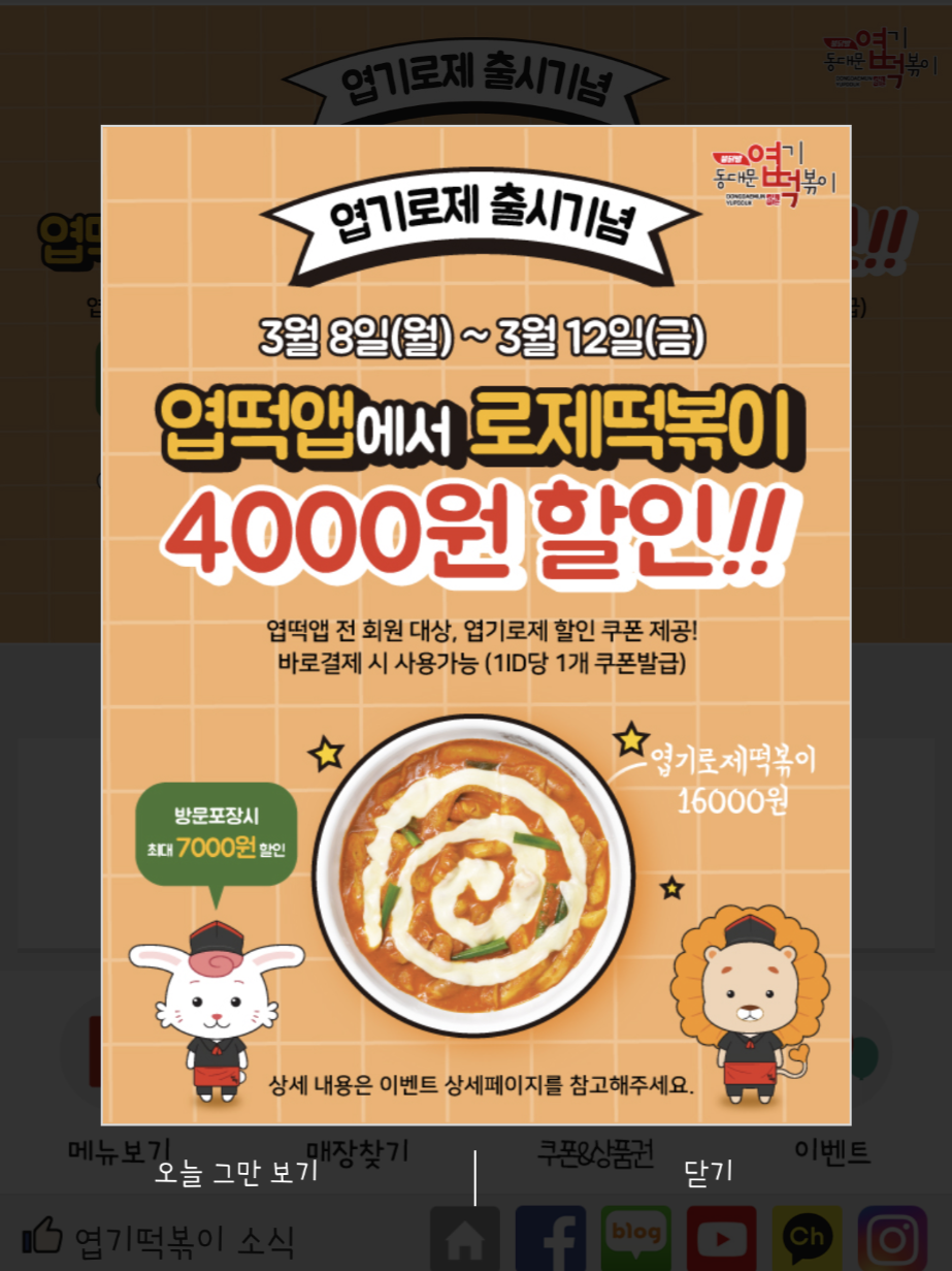 엽기떡볶이 앱에서 출시 기념으로 3월 8일 ~ 3월 12일까지 첫 주문 시에는