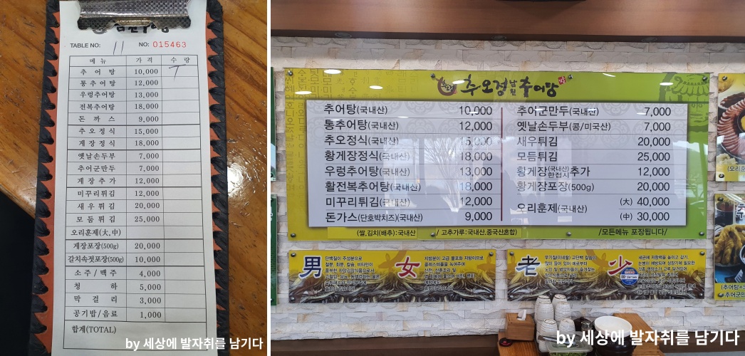 추오정 남원추어탕의 메뉴, 가격이에요.