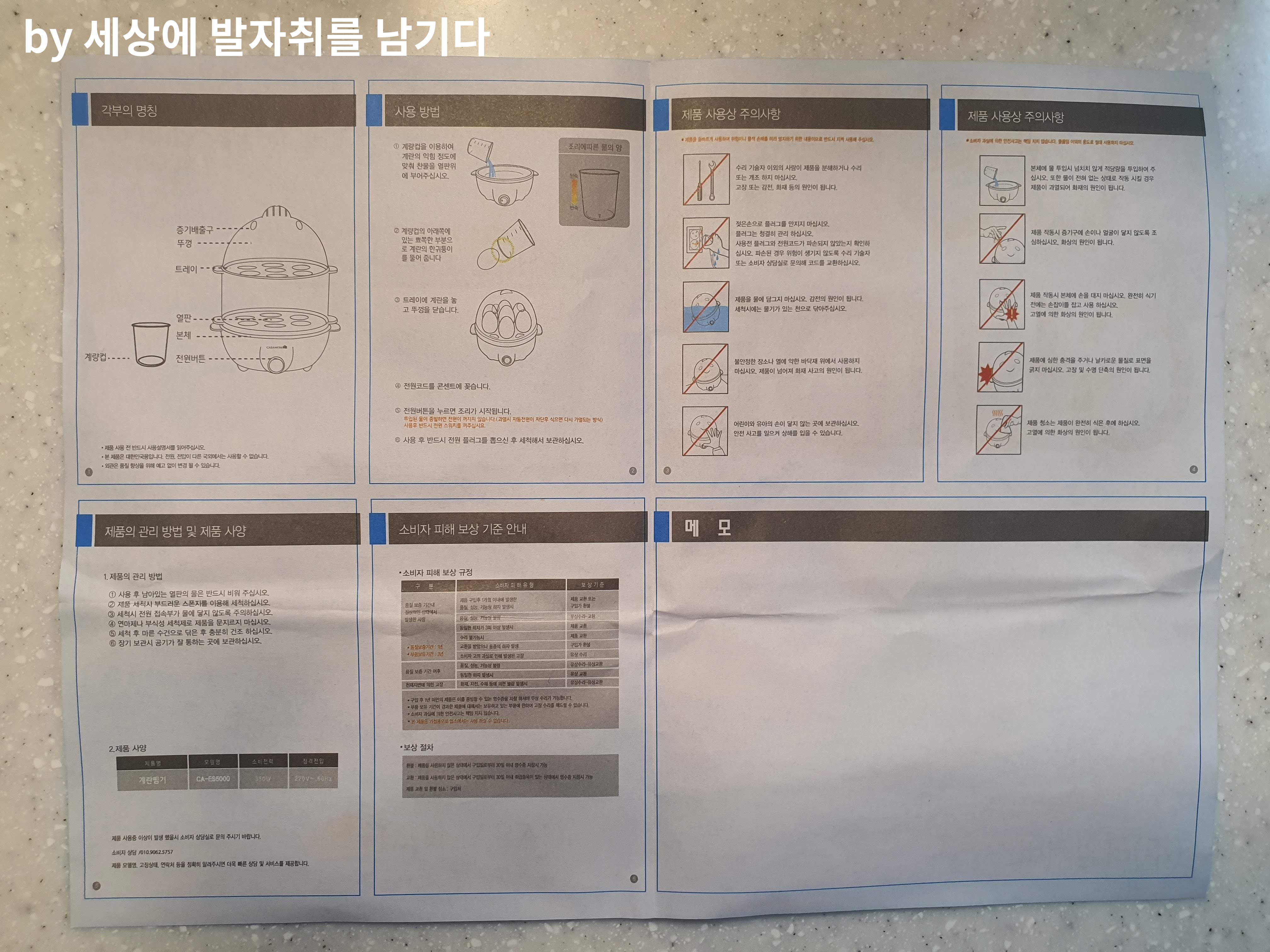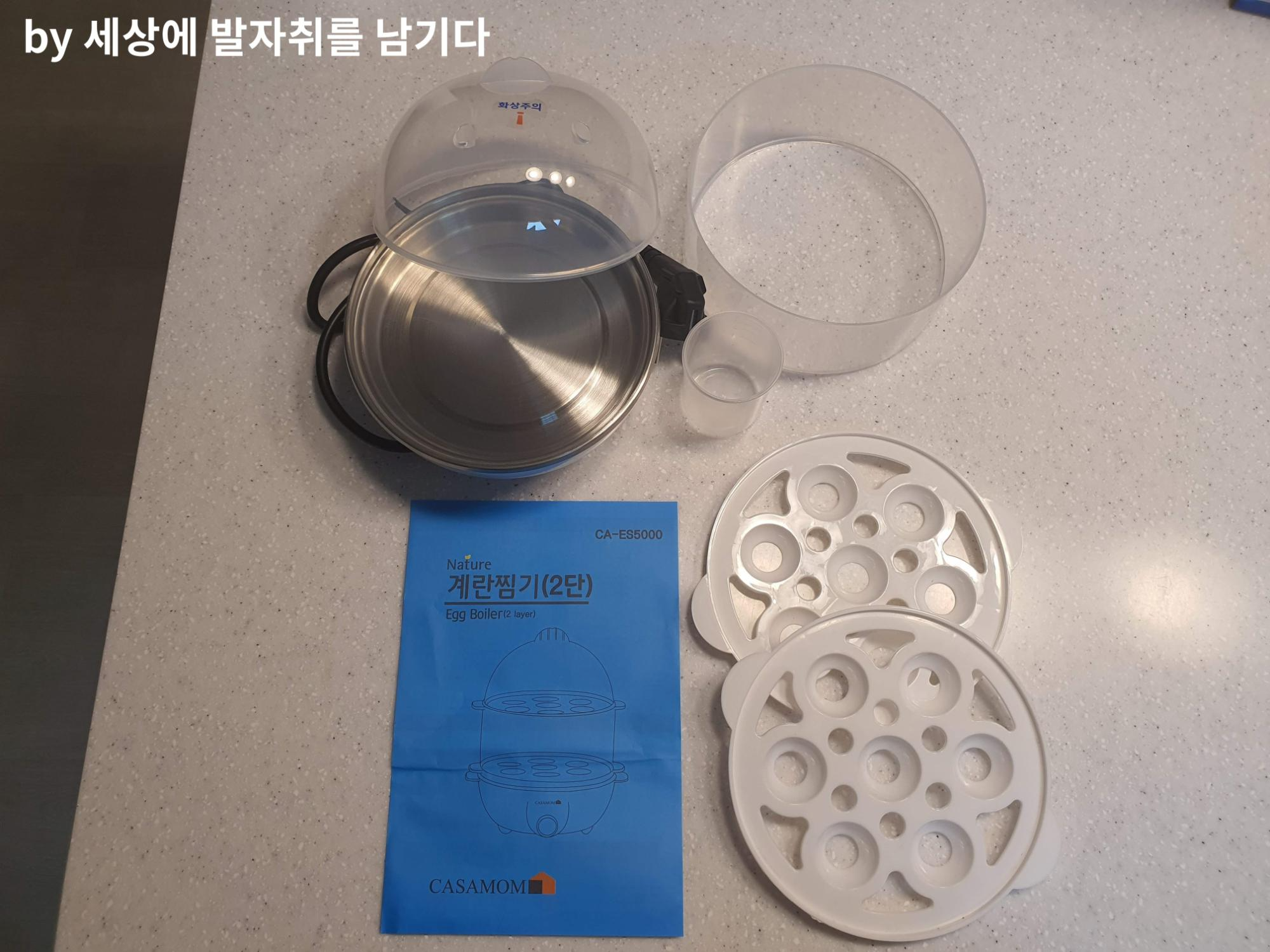 계란찜기의 구성품은 본체와 이단을 위한 칸 분리용 틀, 그리고 물을 넣을 수 있는 컵, 설명서로 되어 있었어요.