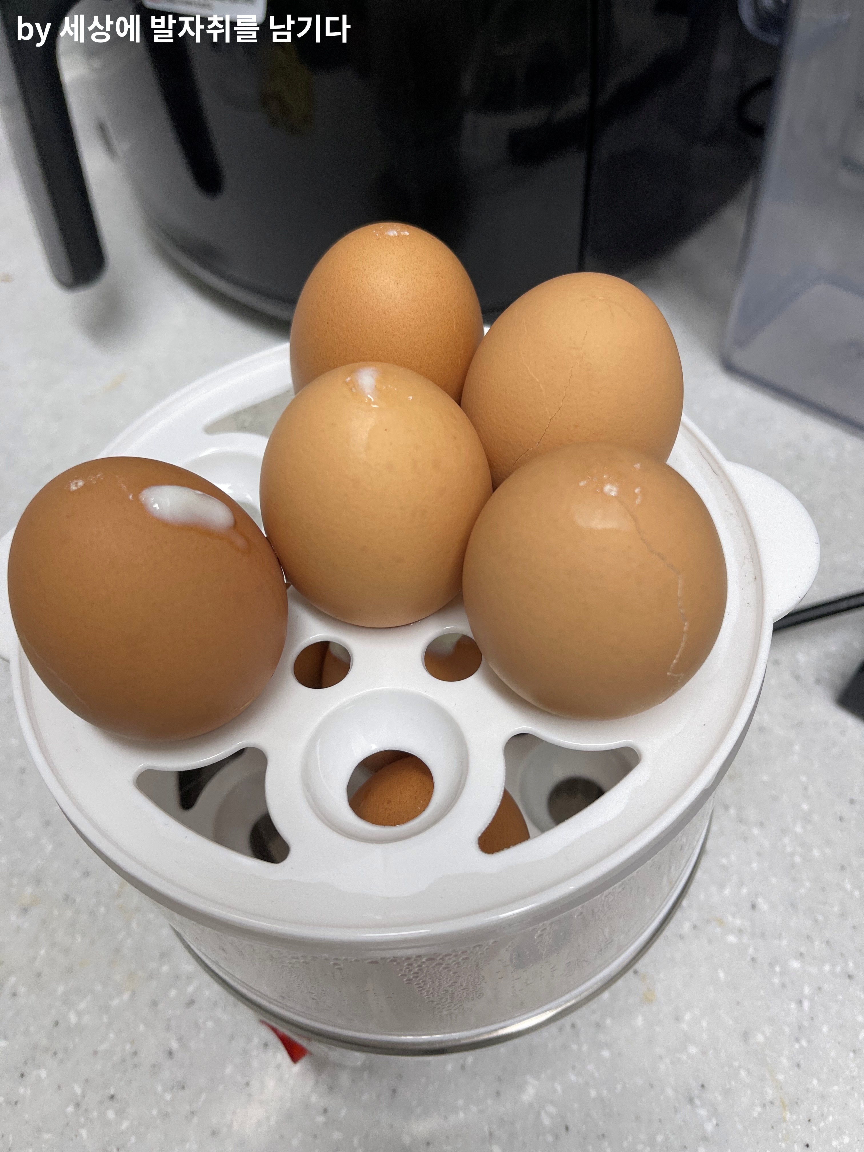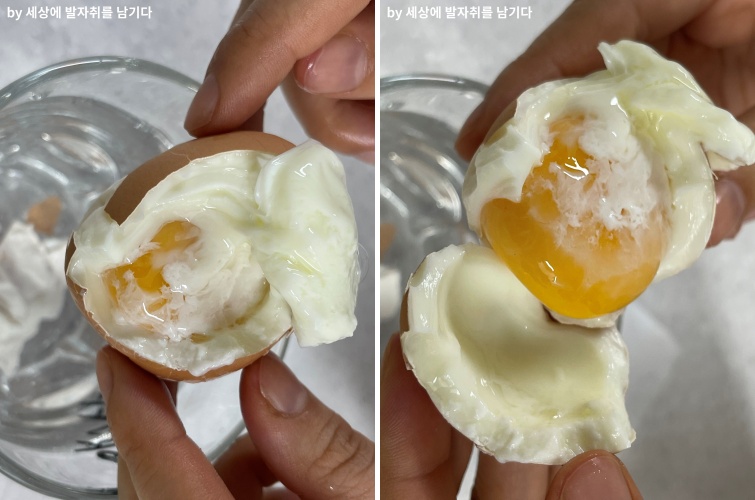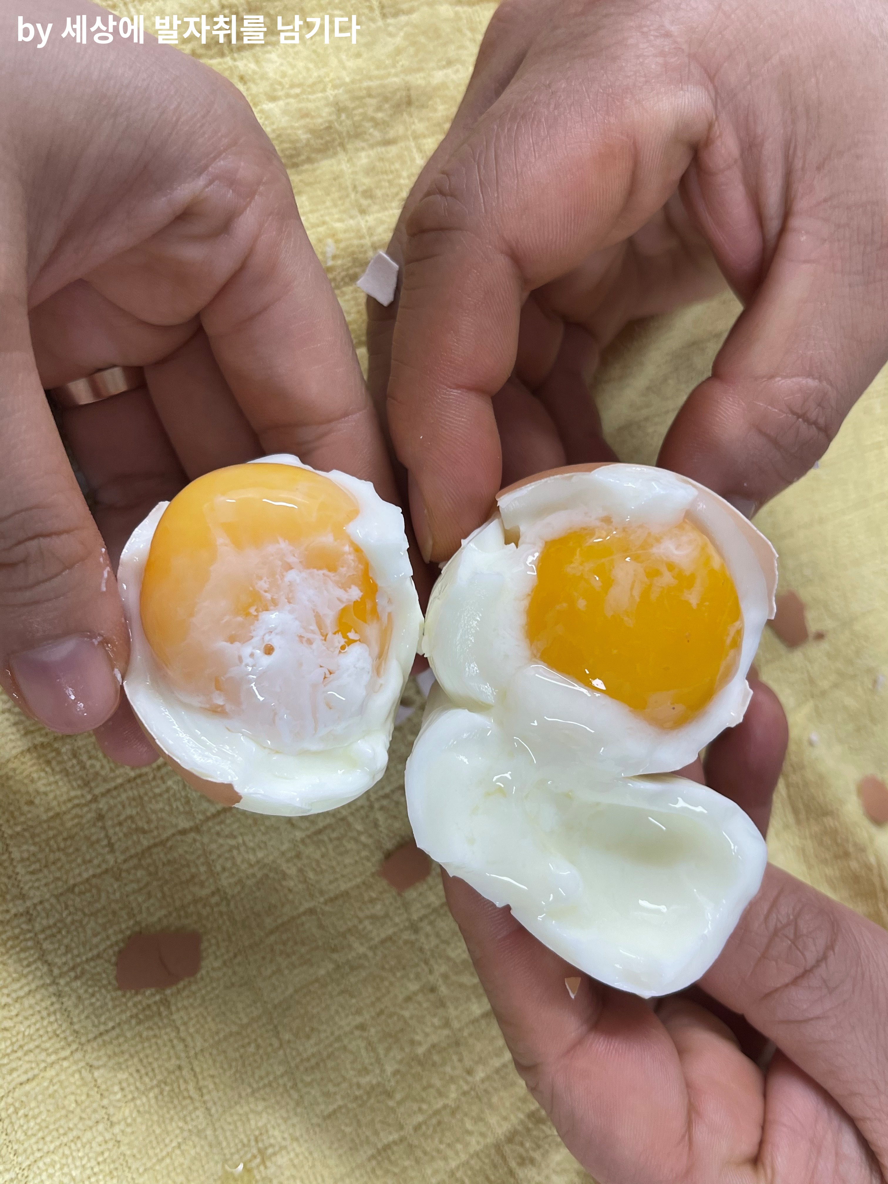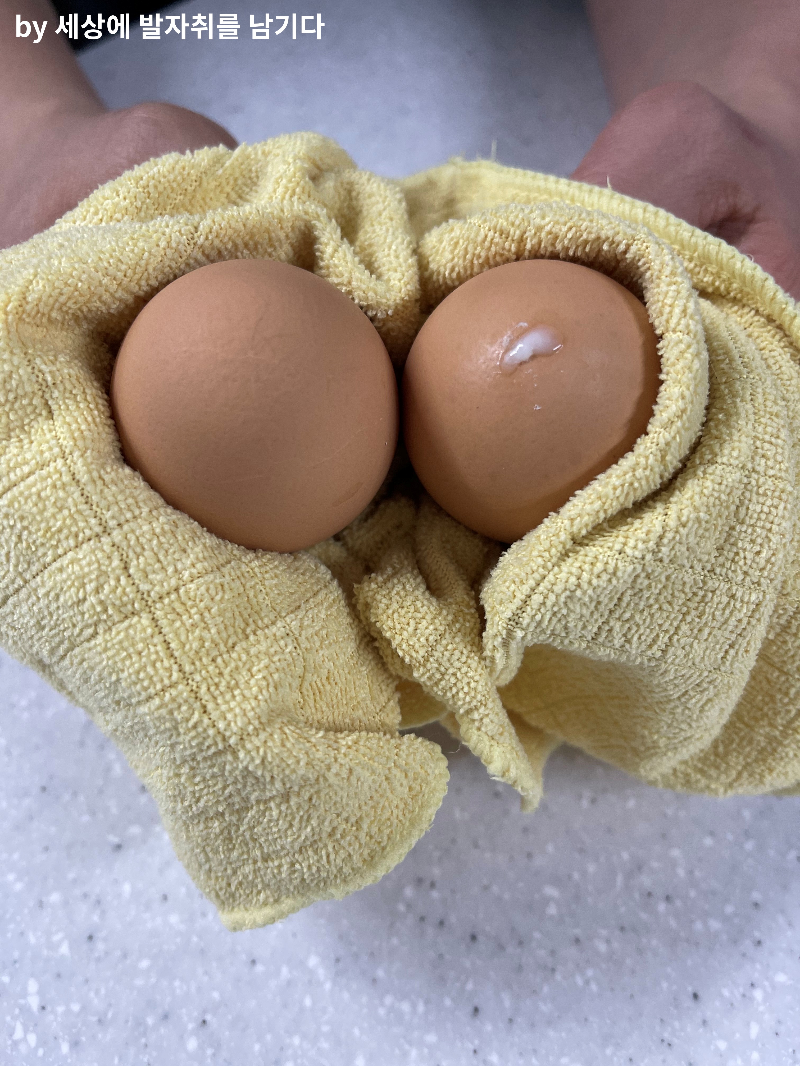 구멍을 뚫지 않은 달걀이 열을 더 잘 가지고 있어서 인지 더 잘 쪄진 거 같아요.