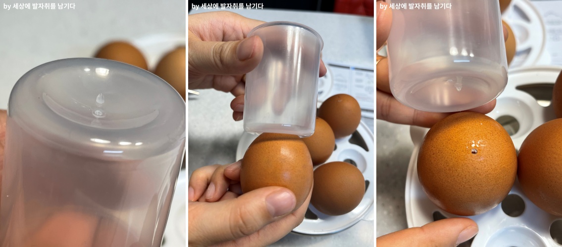 2. 계량컵 아래 뾰쪽한 부분으로 계란의 한 귀퉁이를 뚫어 줍니다.(혹시 계란이 터질지도 몰라서 그런거 같아요.)