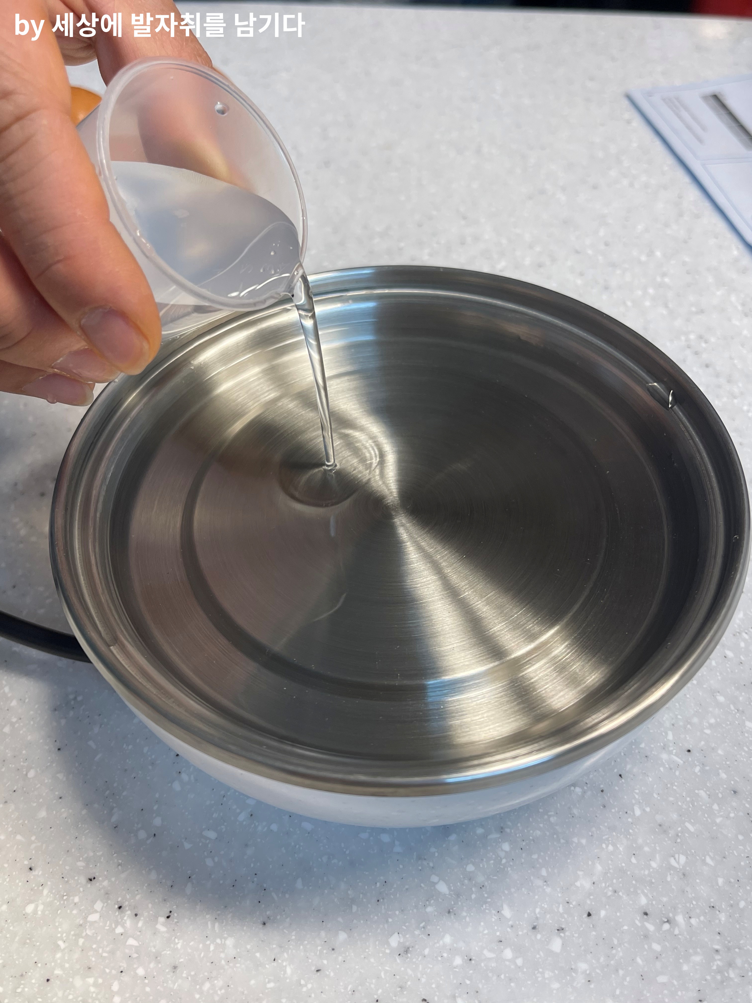 1. 본체에 컵을 이용해서 적당량 물을 넣어줍니다.