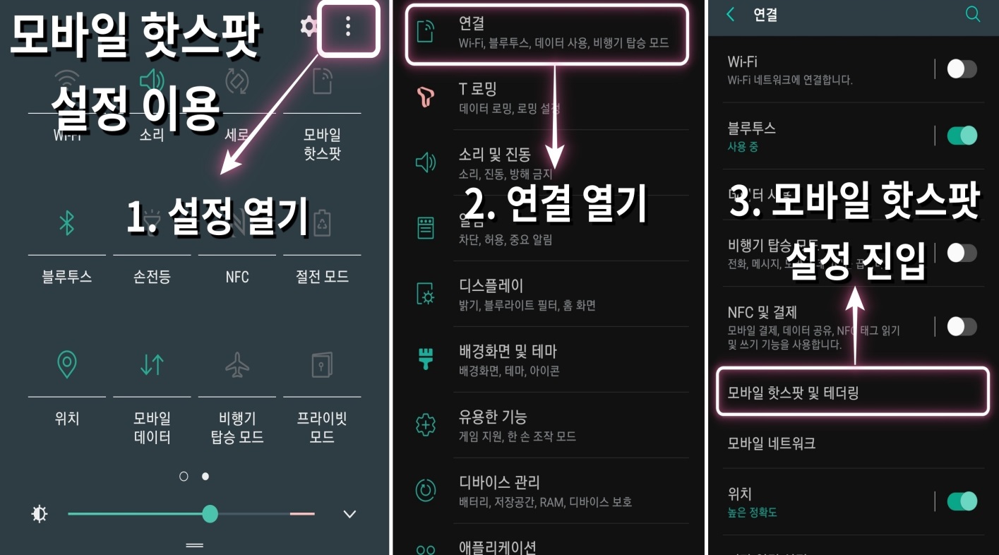 핫스팟, 테더링은 모바일 기기의 데이터를 이용해서 와이파이 망을 구성해주는 기능을 해요.