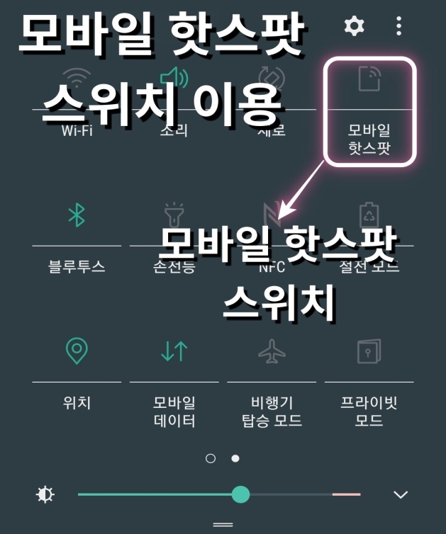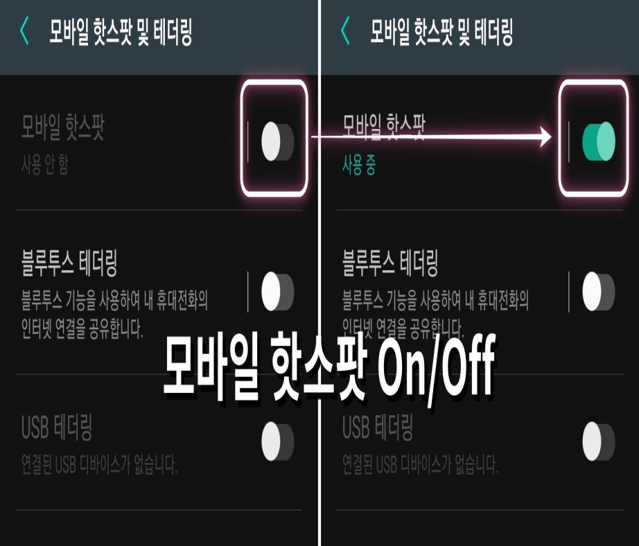 이렇게 한번 설정을 하고 나면 추후에는 간단히 스위치 On/Off만으로 모바일 핫스팟을 사용하시면 됩니다.