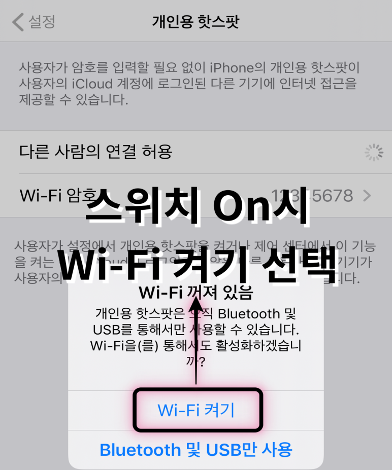 모바일 핫스팟을 켜실 때 'Bluetooth' 또는 'USB' 연결뿐만 아니라 'Wi-Fi'를 통해서도 활성화가 가능합니다.
