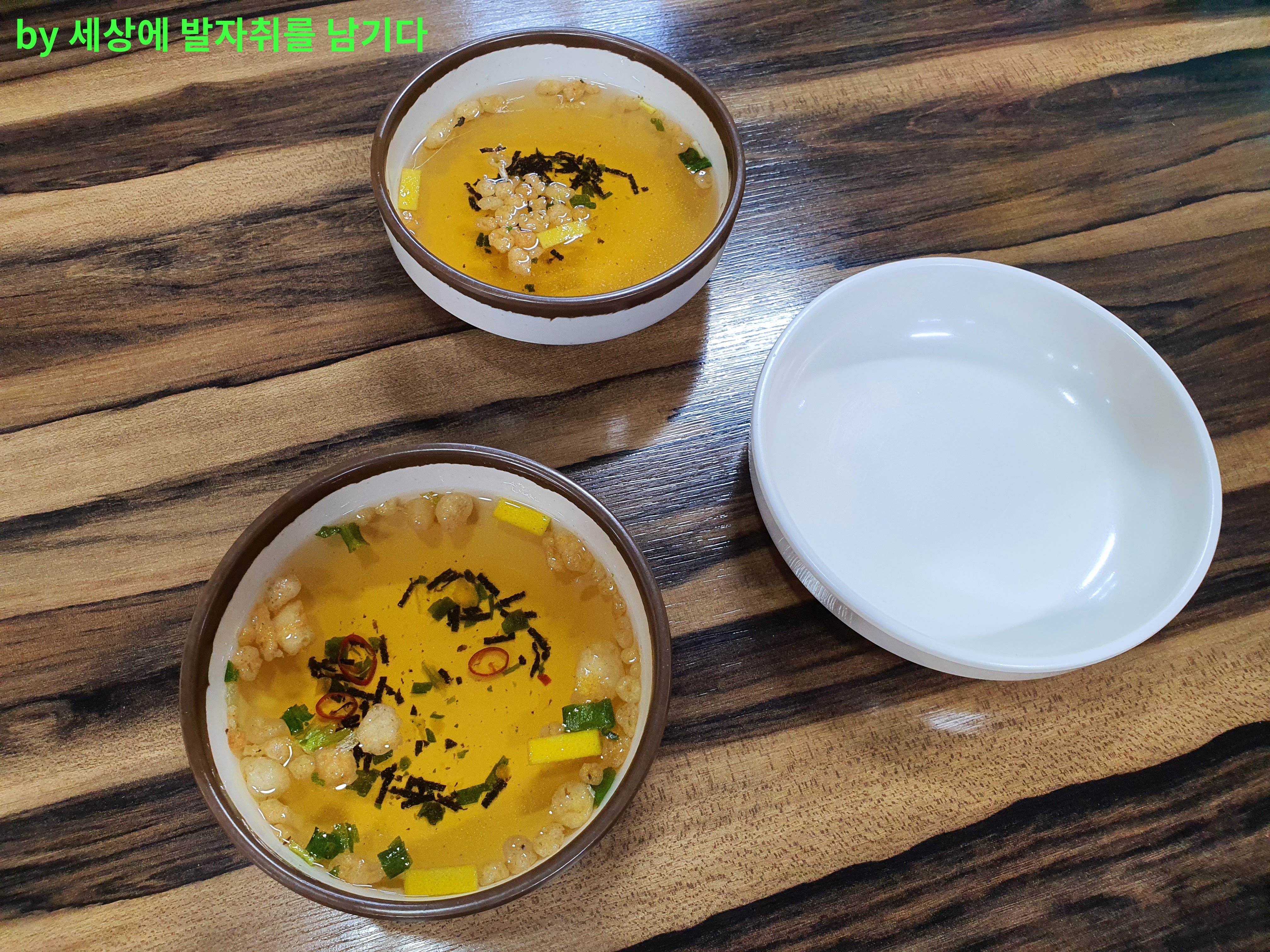 자리에 앉아서 주문을 하면 우동 국물 같은 것을 줘요.