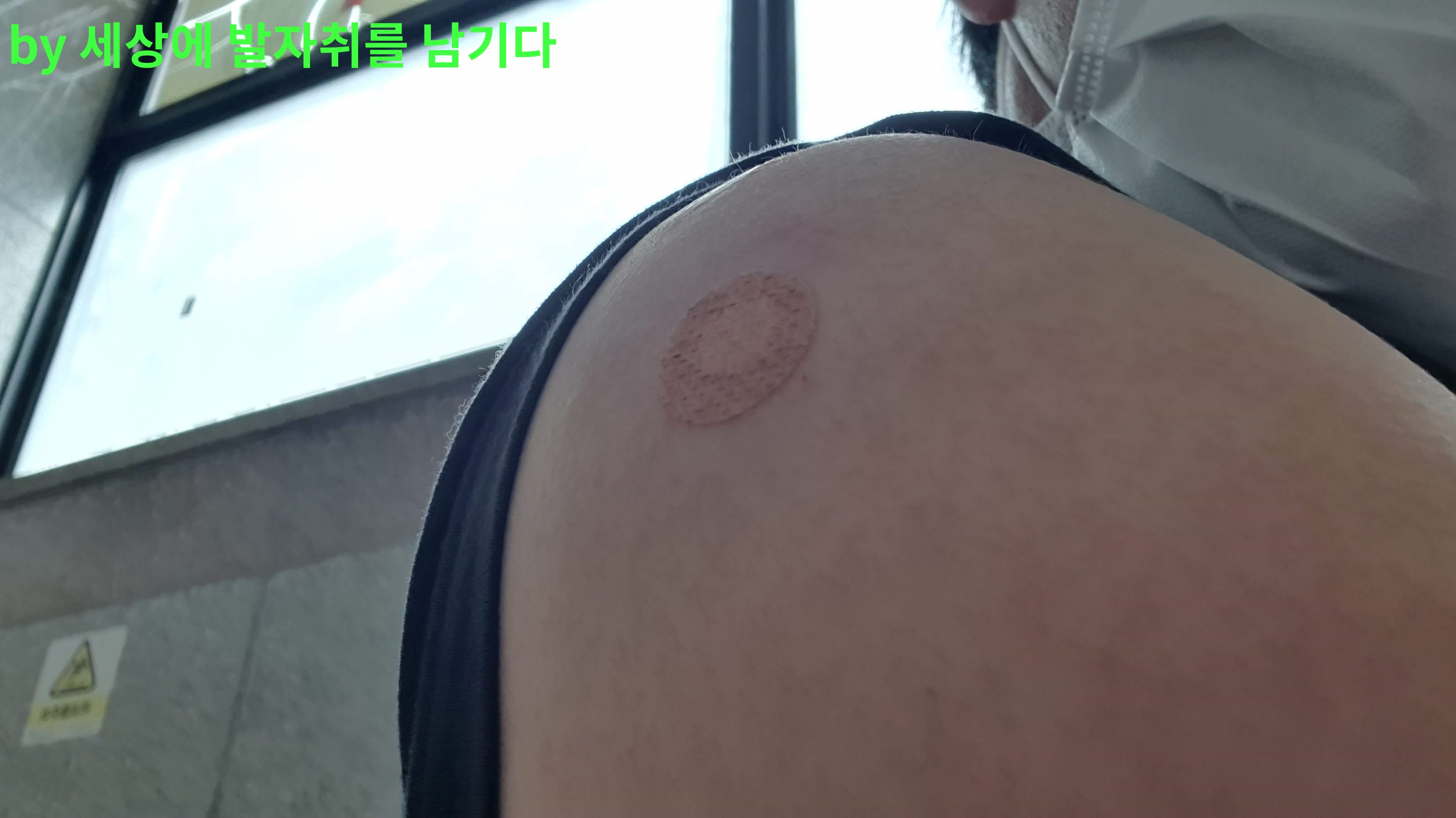 백신 주사바늘은 엄청 얇아서 움직이지 않는 상태에서 바로 주사 맞은 곳에 스티커를 붙여 줬어요.