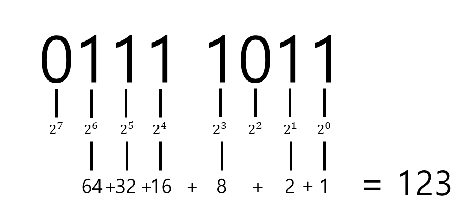 2진수 '0111 1011'을 10진수로 표현을 하면 2의 n승한 값에 그 자릿수를 곱하여 나온 값을 전부 더하면 10진수로 변환됩니다.