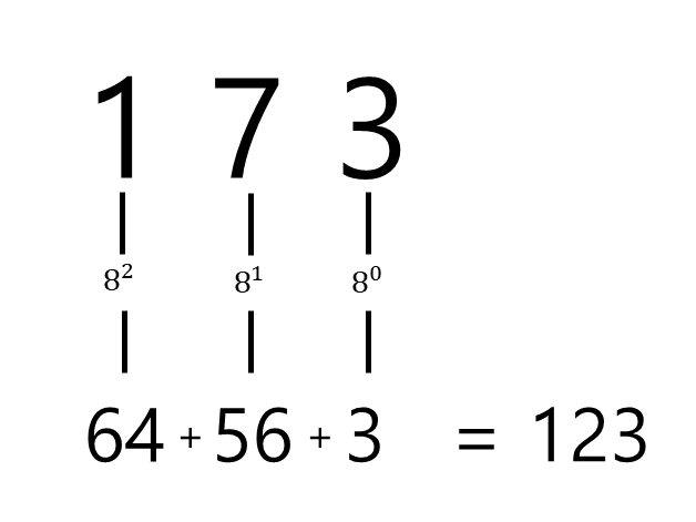 8진수 '173'을 10진수로 표현을 하면 8의 n승한 값에 그 자릿수를 곱하여 나온 값을 전부 더하면 10진수로 변환됩니다.